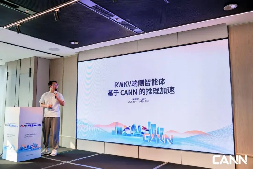大湾区昇腾算力应用创新研究院优秀专家、RWKV 社区Maintainer 王富平,带来 RWKV 端侧智能体基于 CANN 的推理加速技术分享。他介绍,RWKV7 作为新一代线性注意力架构,训推阶段复杂度低,在多智能体并发、端侧轻量化部署上优势显著。依托 CANN 底层能力,双方联合打造 cann-ops-rwkv、rwkv7-acl 等共建项目,实现算子开发、多框架适配与推理优化,适配深圳智能硬件、机器人等产业需求,也为开发者参与开源共建提供路径,推动 AI 技术加速落地。