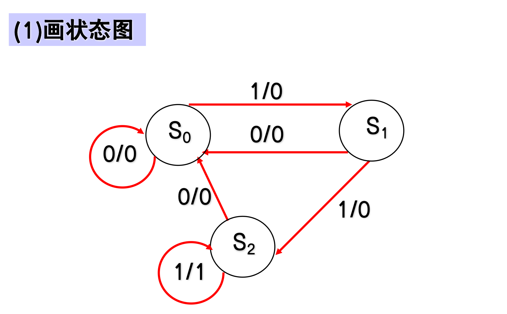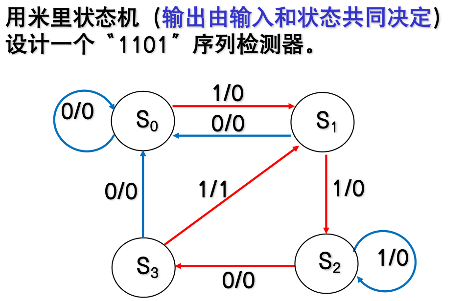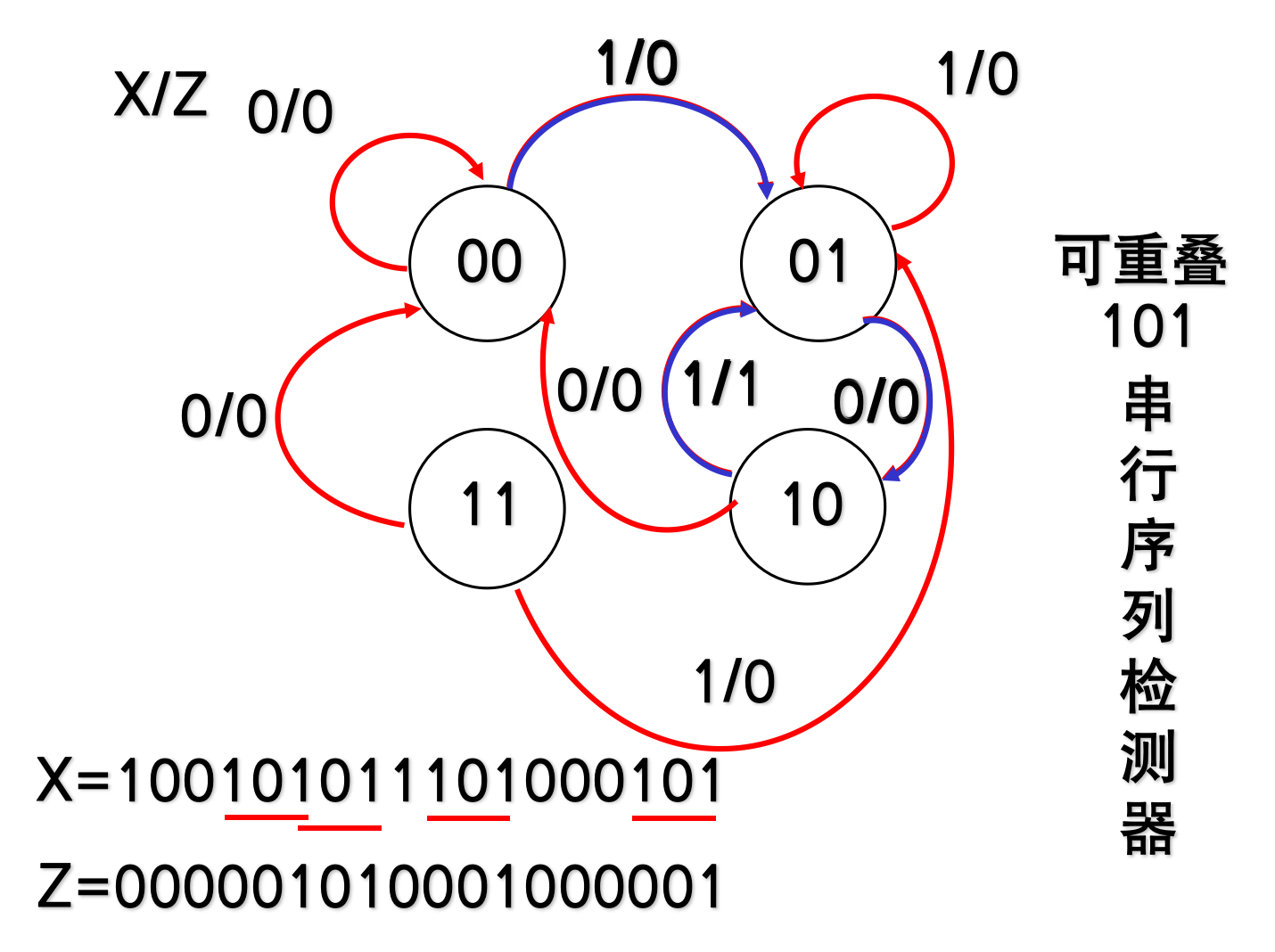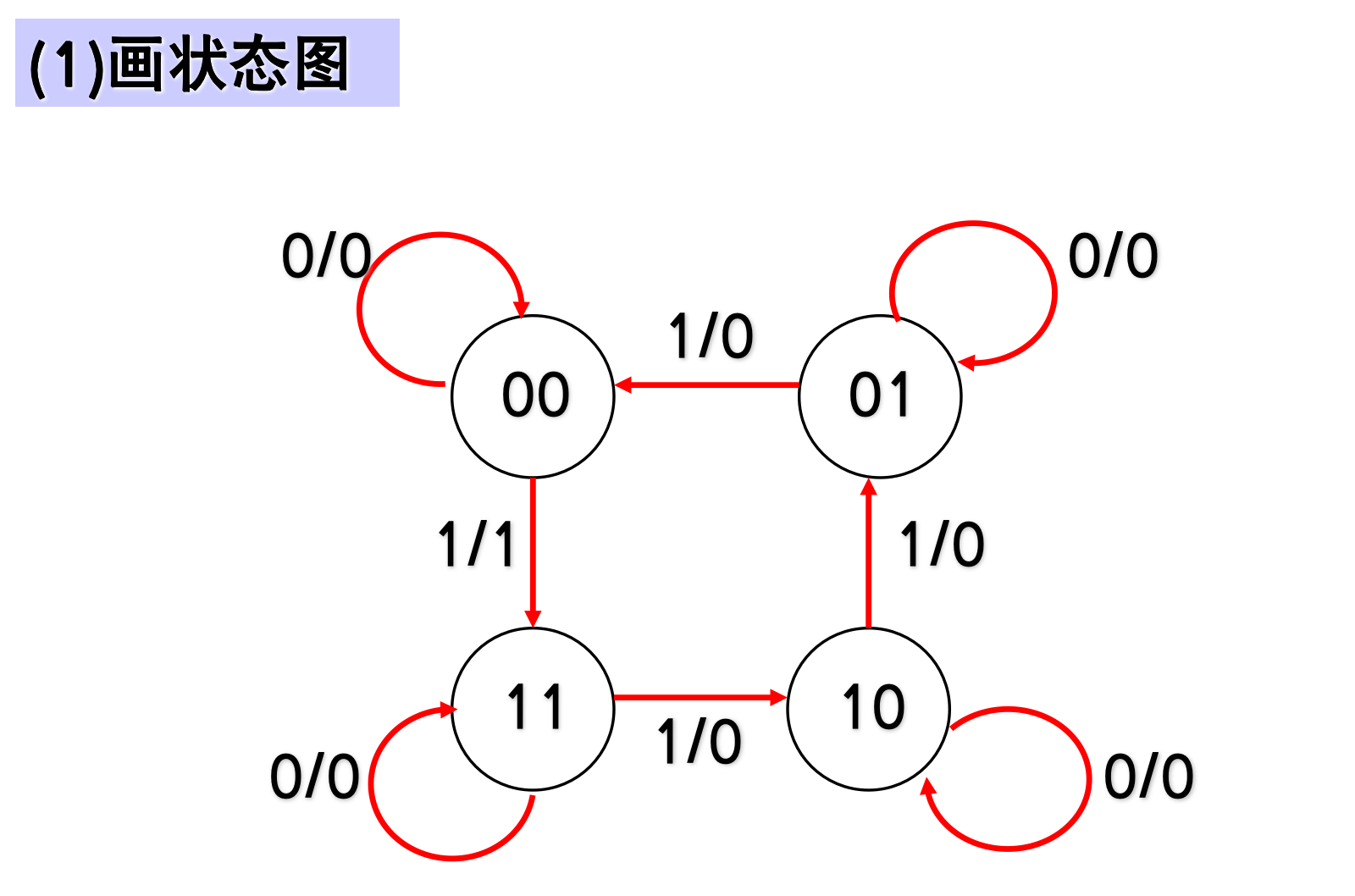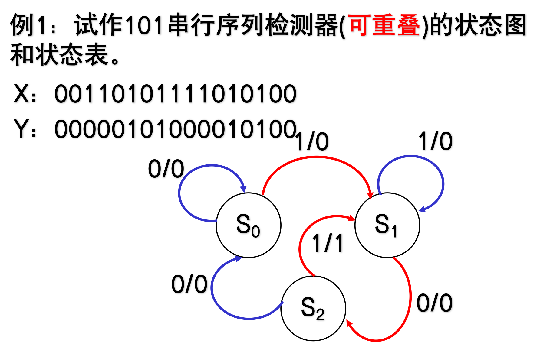 - 摩尔电路的输出电路简略,但是状态图个数多1!必须用一个单独状态来表示检测到序列,同时赋予输出值!