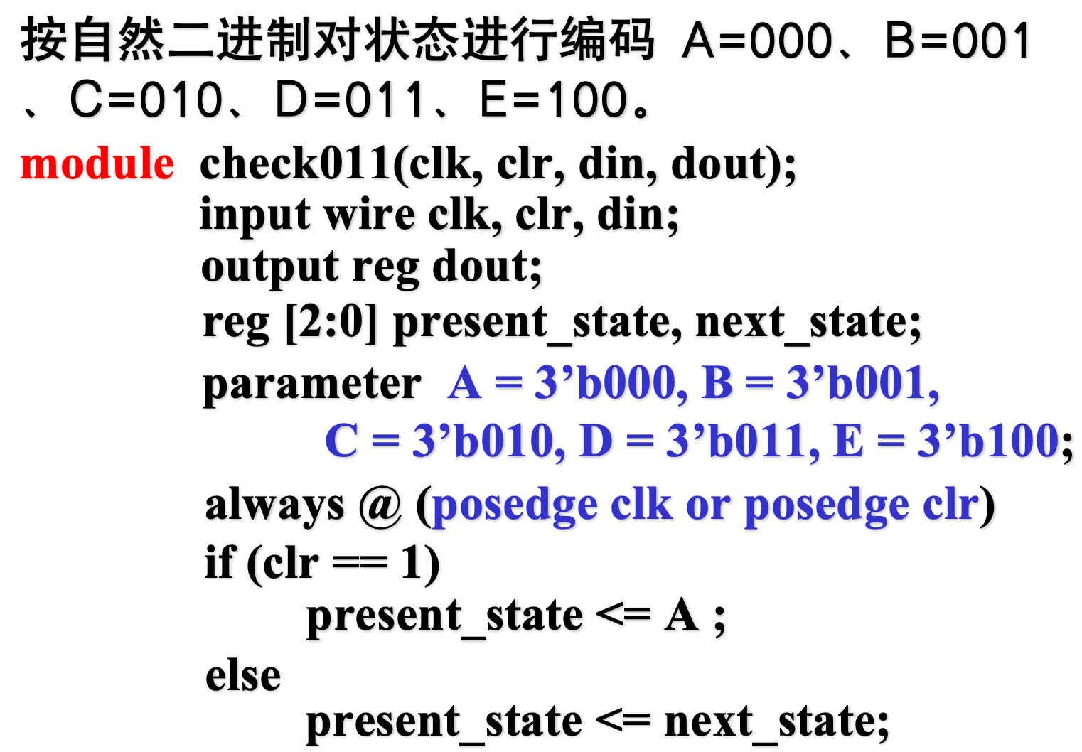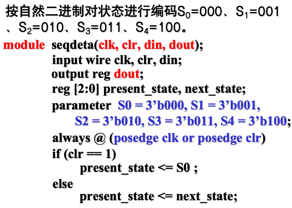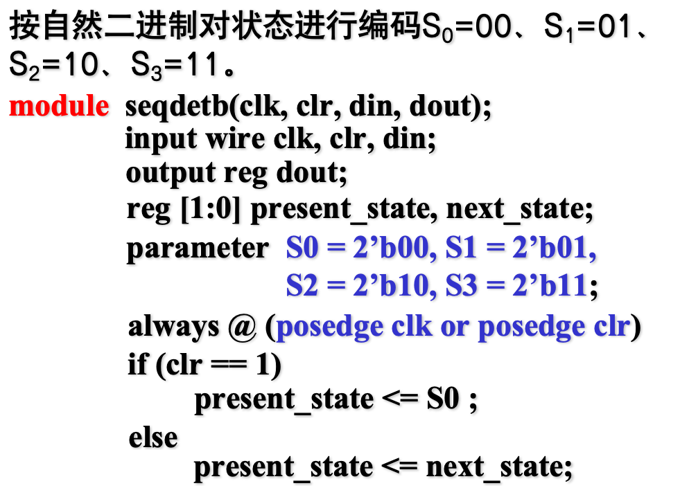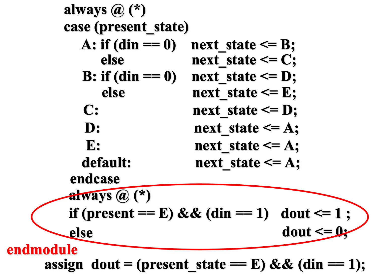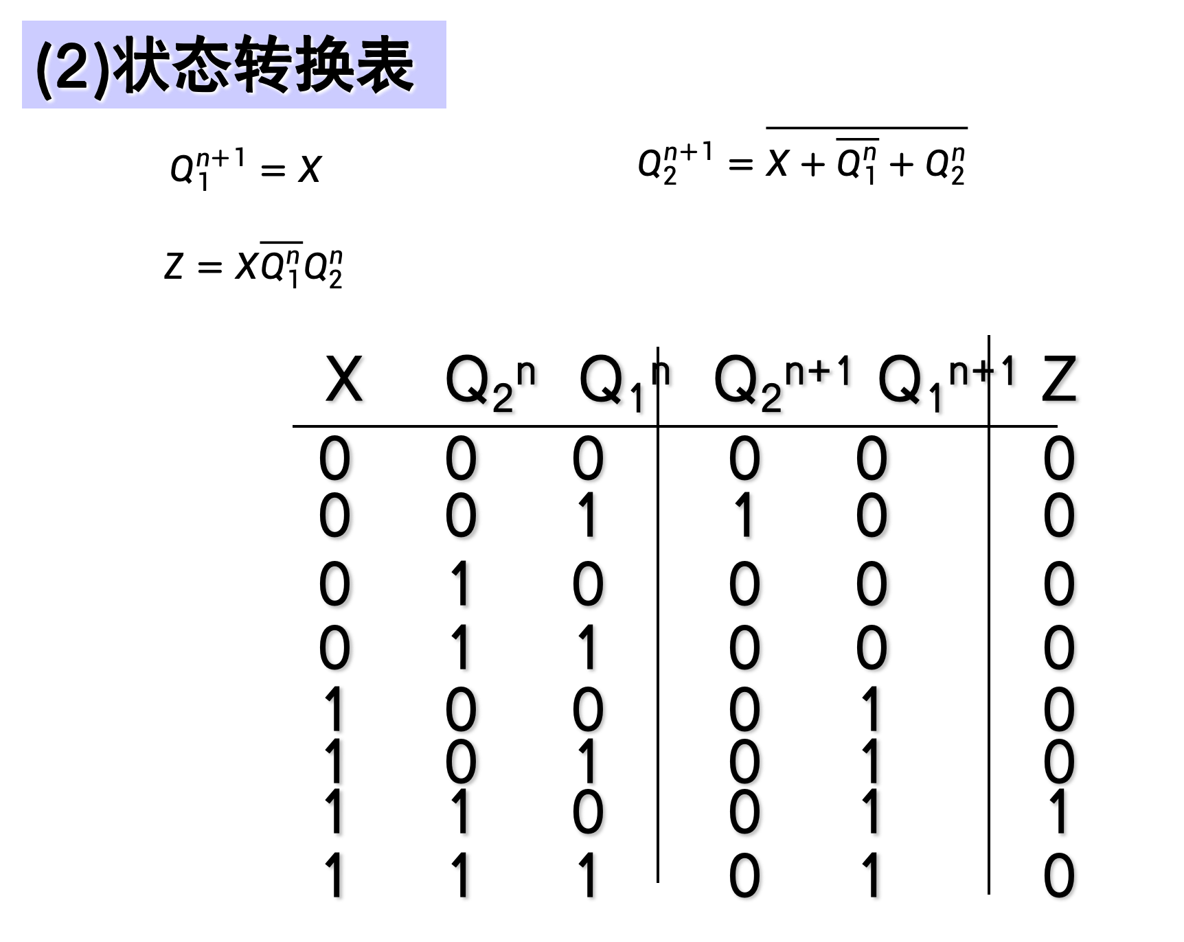 - 摩尔电路的输出电路简略,但是状态图个数多1!必须用一个单独状态来表示检测到序列,同时赋予输出值!
