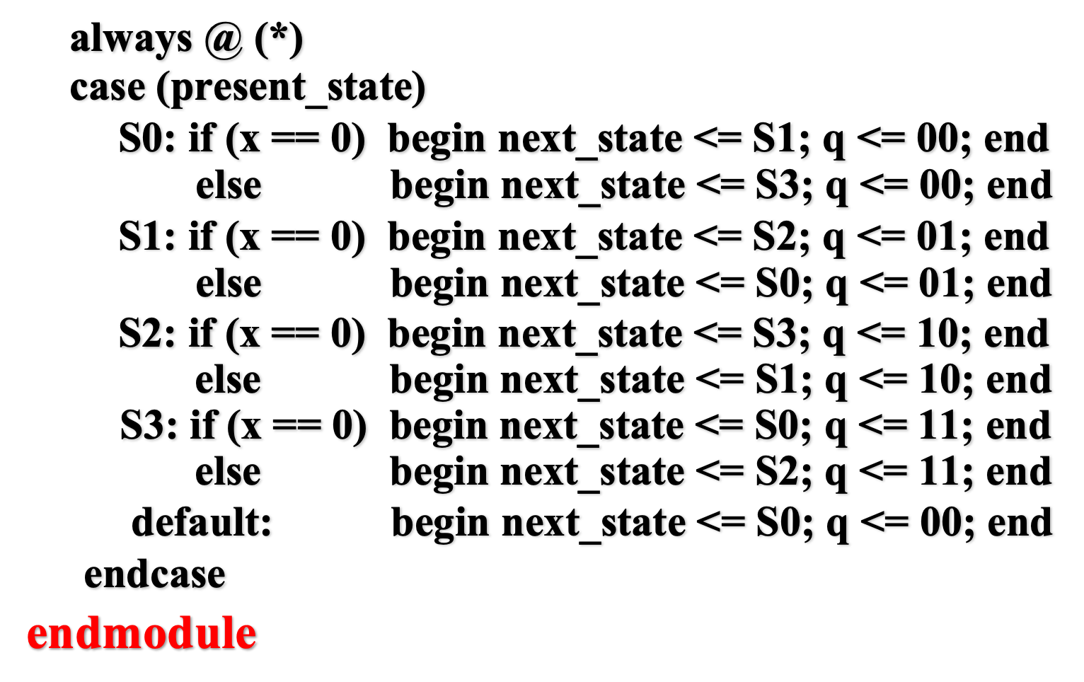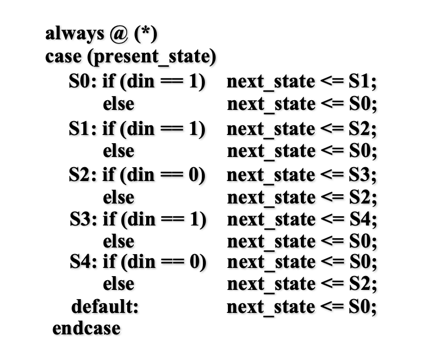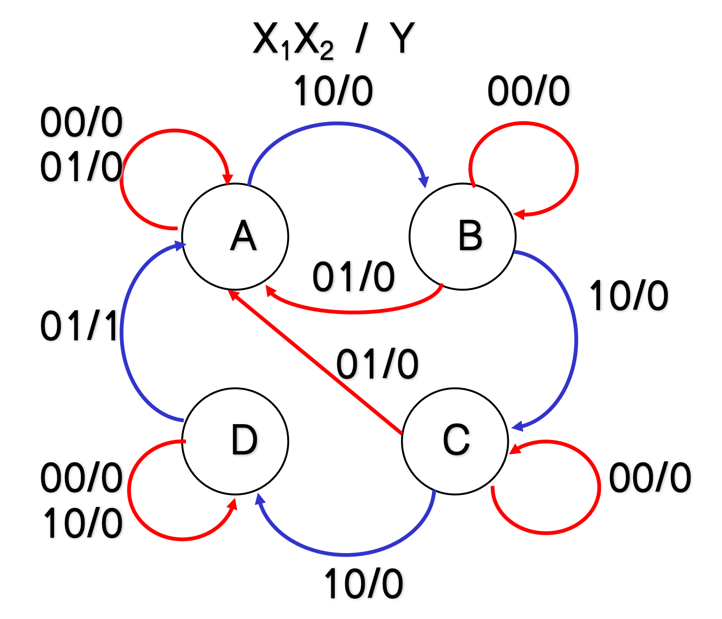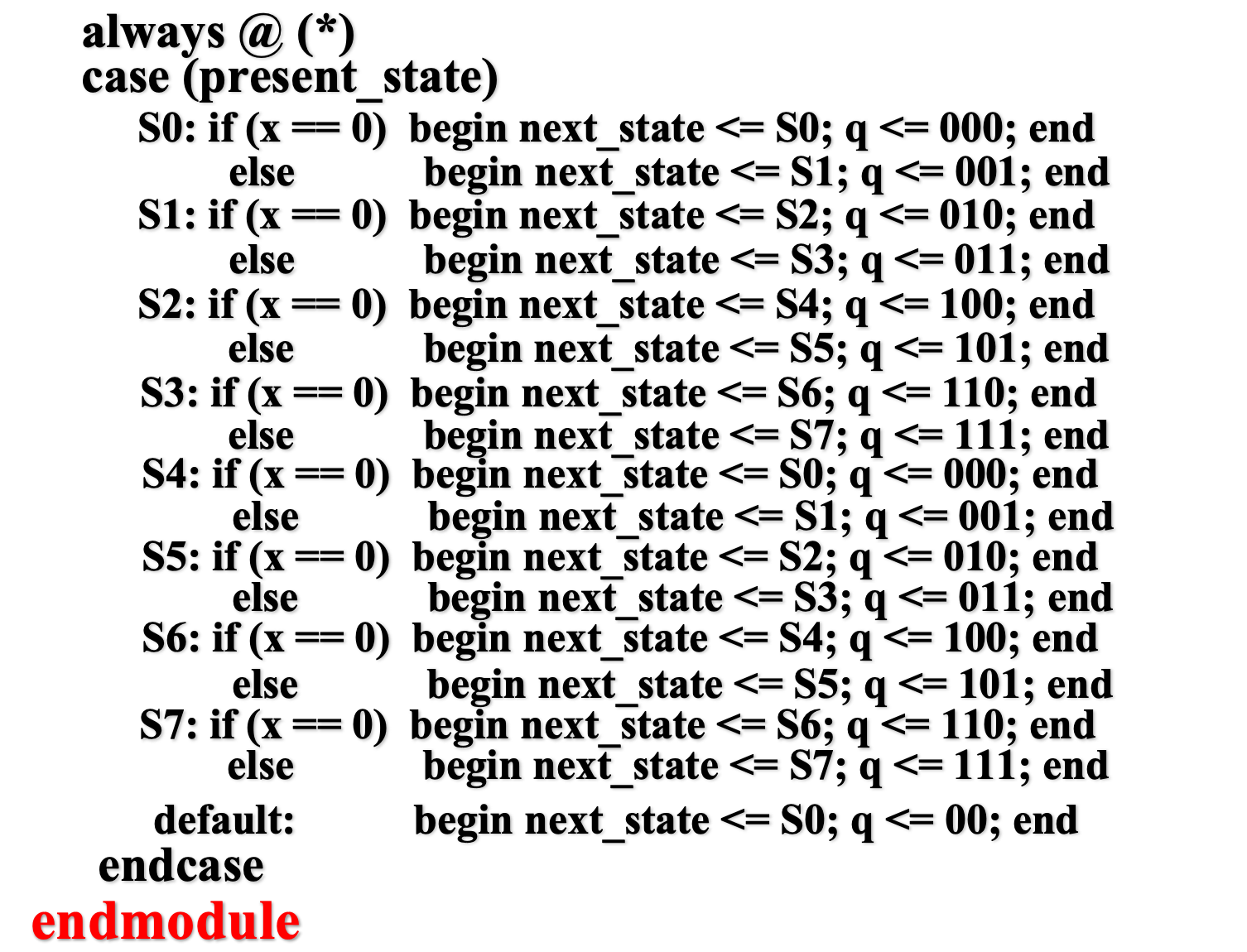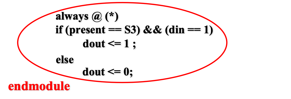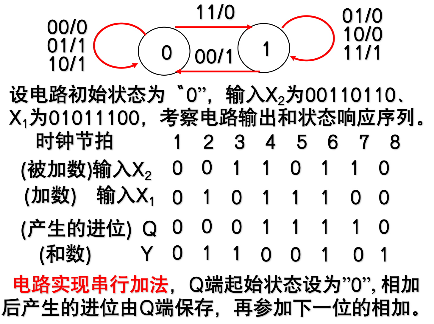 - 摩尔电路的输出电路简略,但是状态图个数多1!必须用一个单独状态来表示检测到序列,同时赋予输出值!