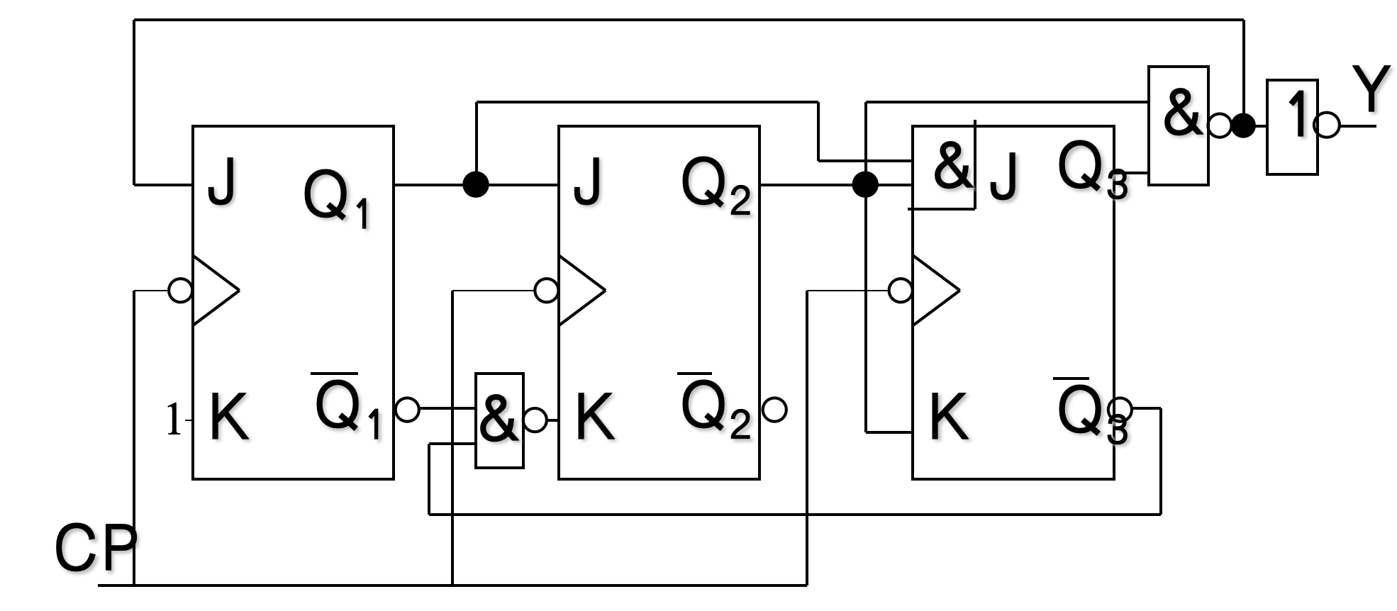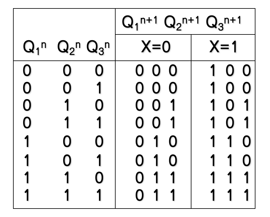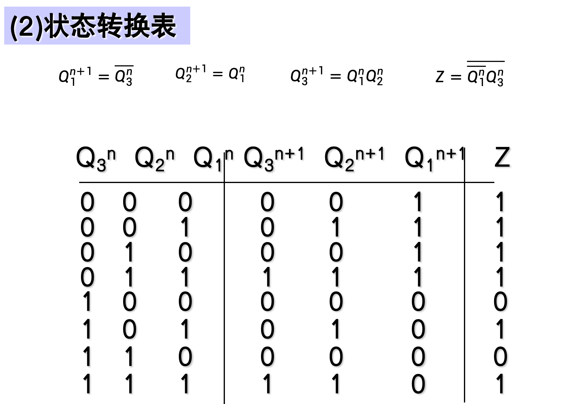 根据以上要求可直接作出该寄存器的状态图和状态表。Q1,Q2,Q3依次存数字的 高,次高,低;