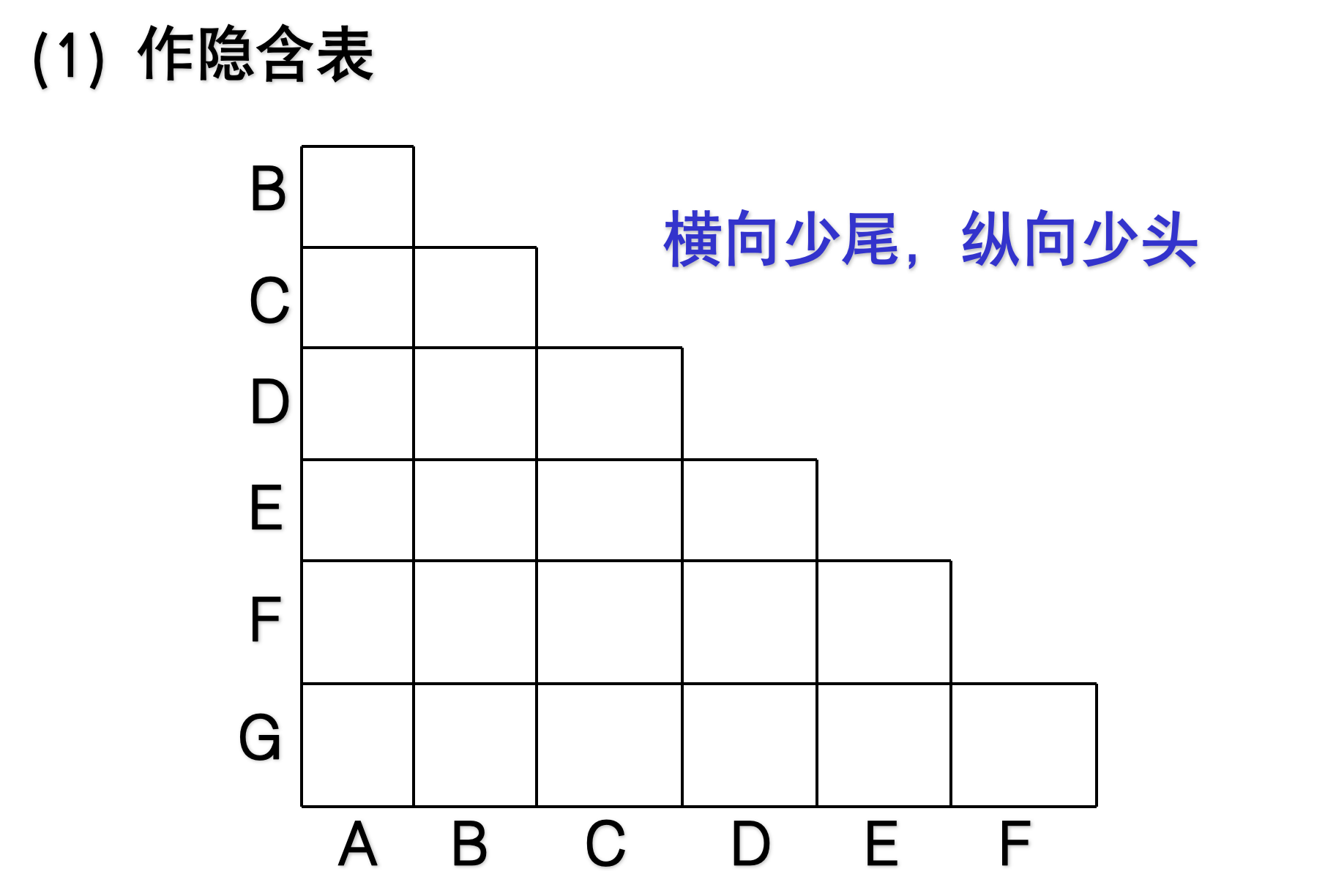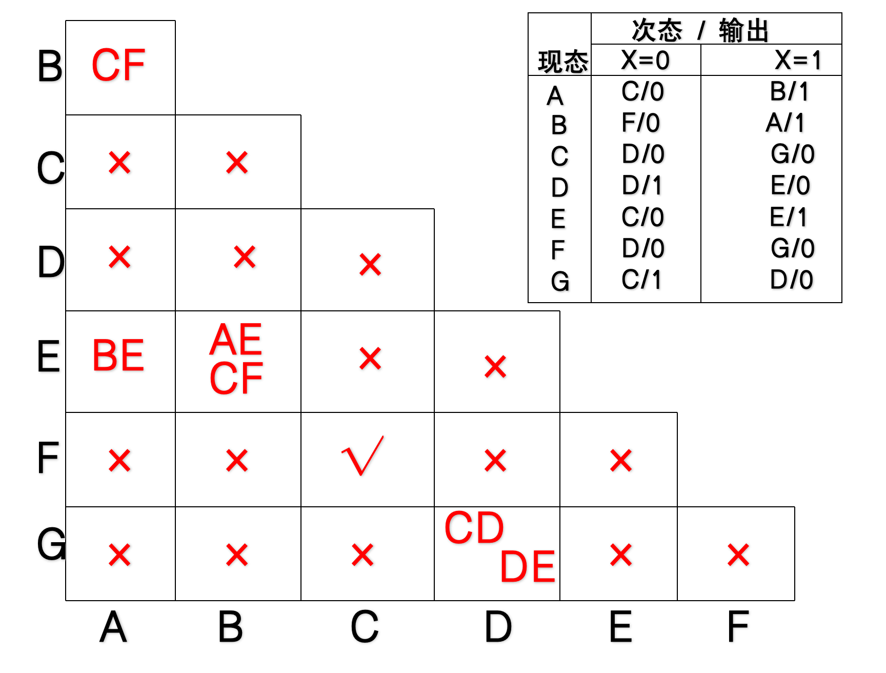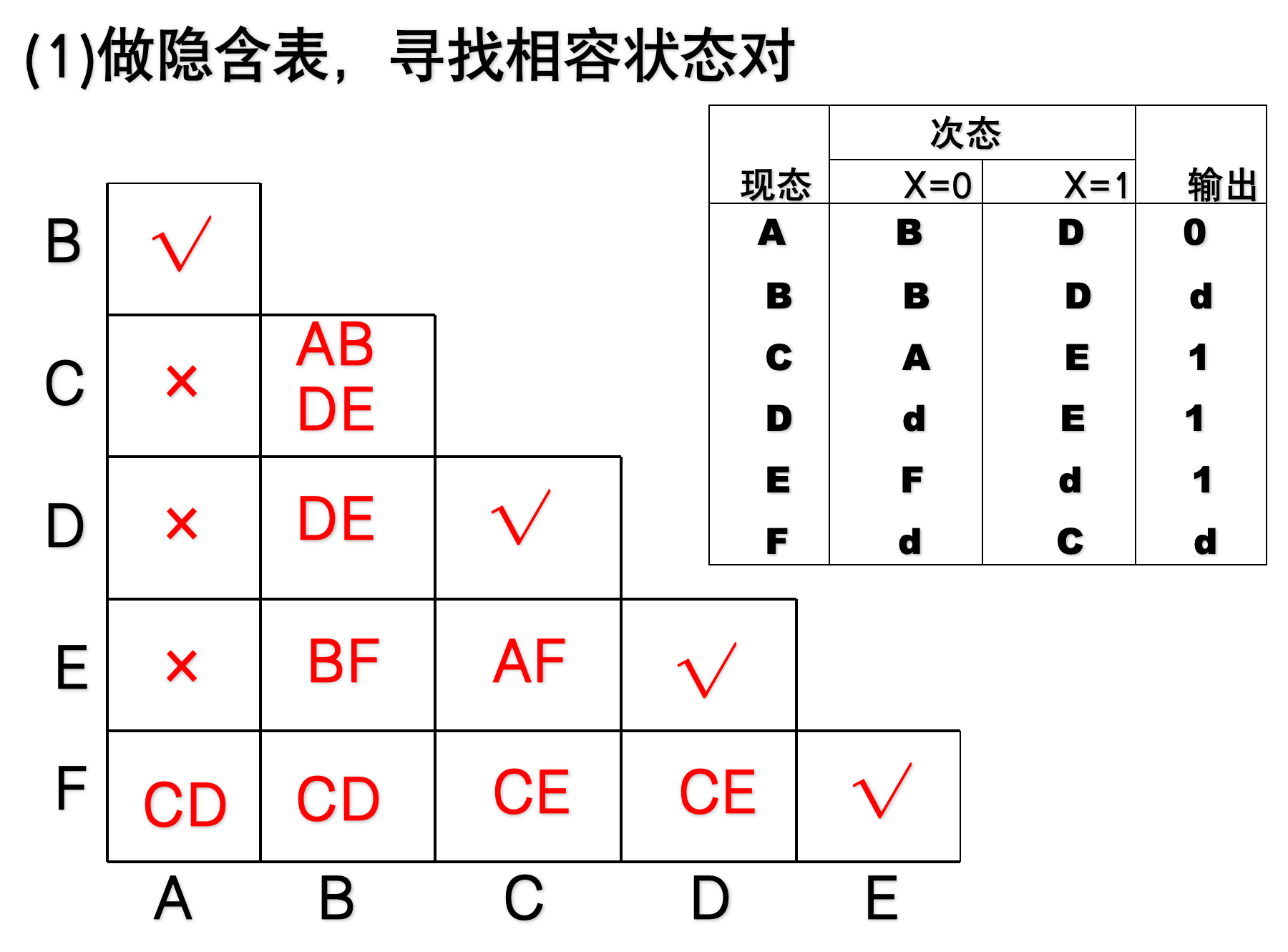 - 第一步:作隐含表,寻找相容状态对(这和完全确定状态表的做法完全一样)