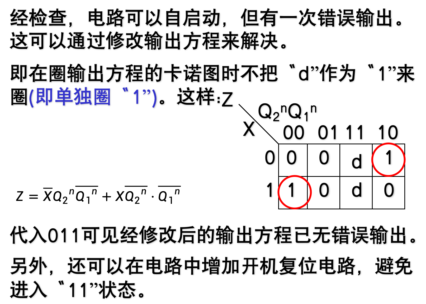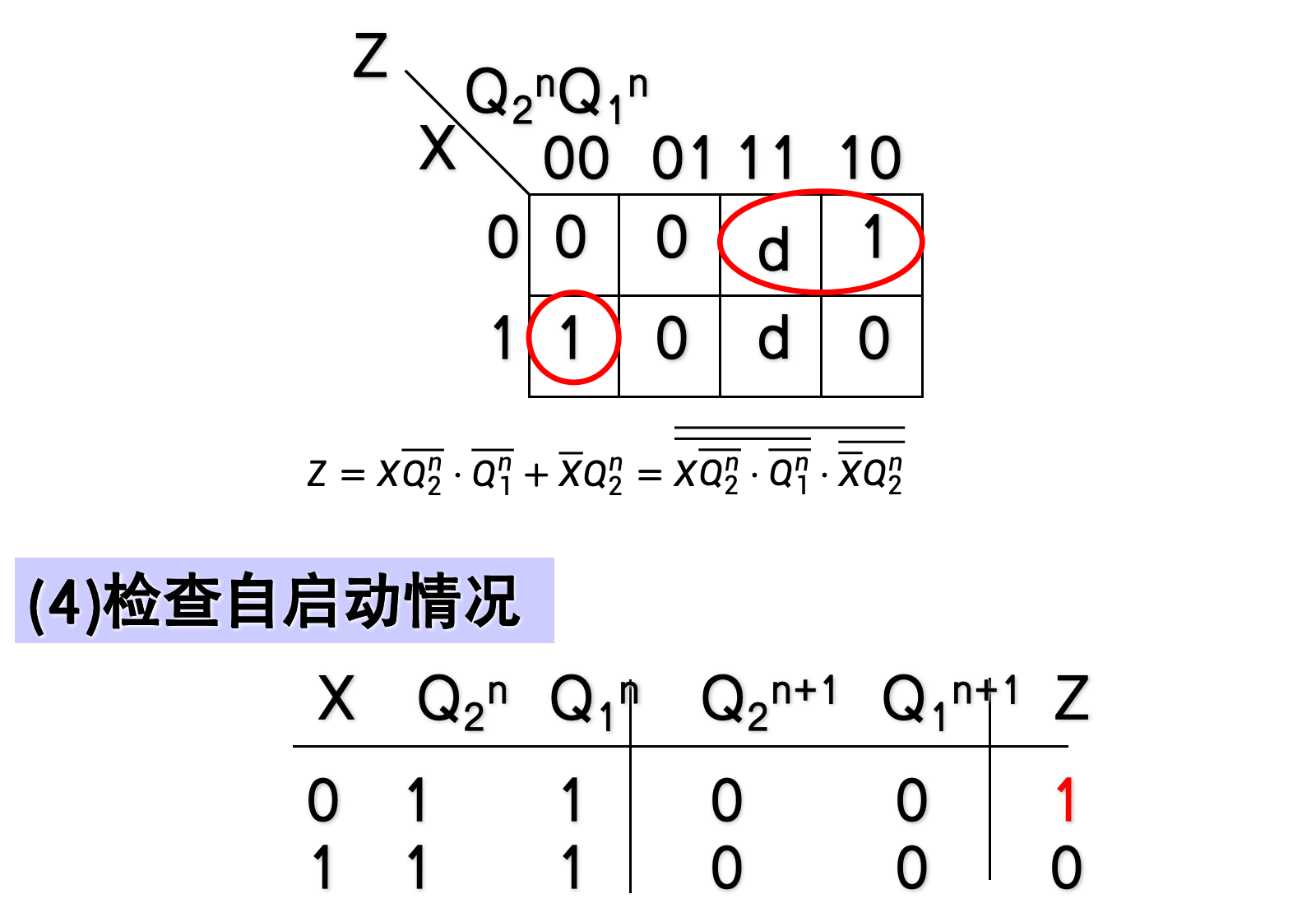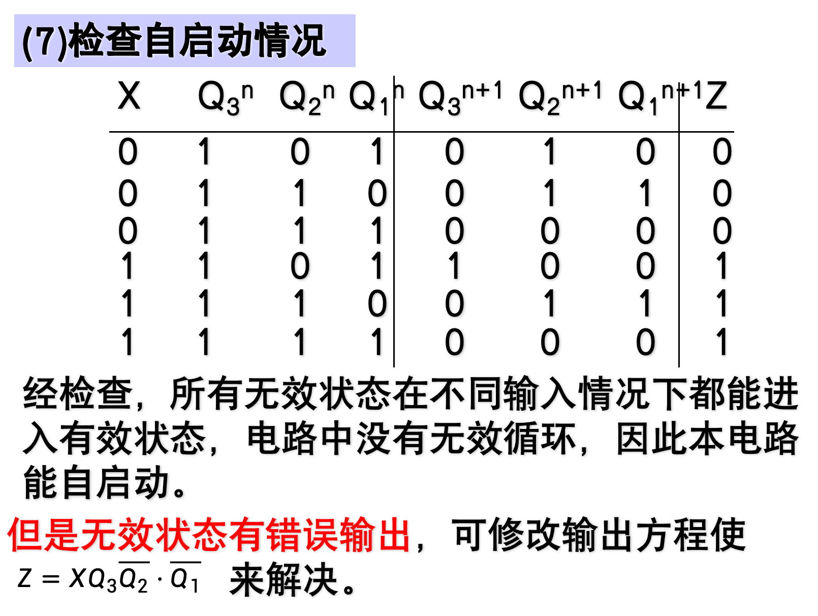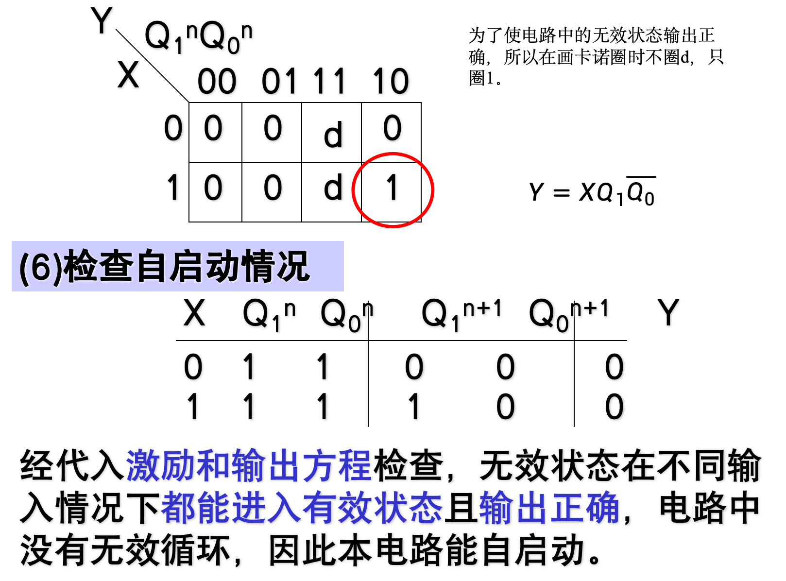 - 对于存在无效状态的电路需要讨论其自启动情况