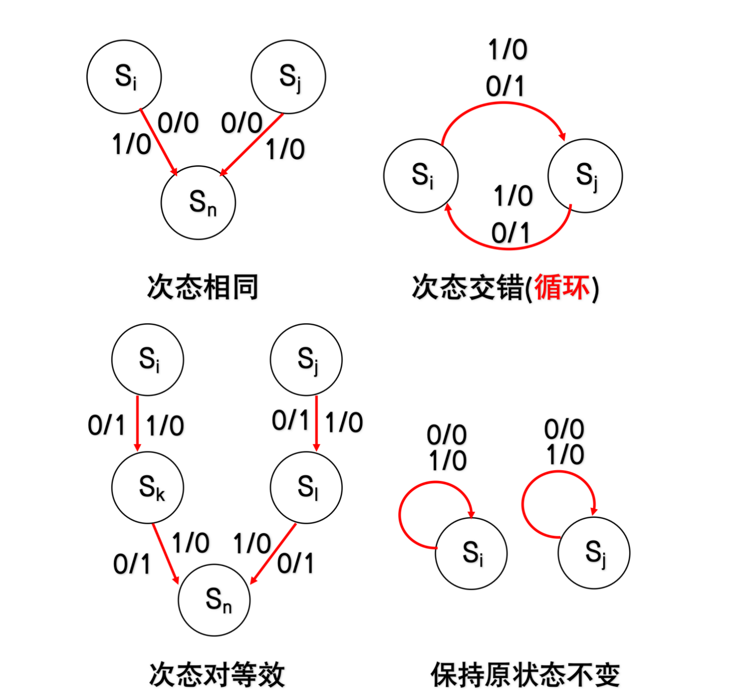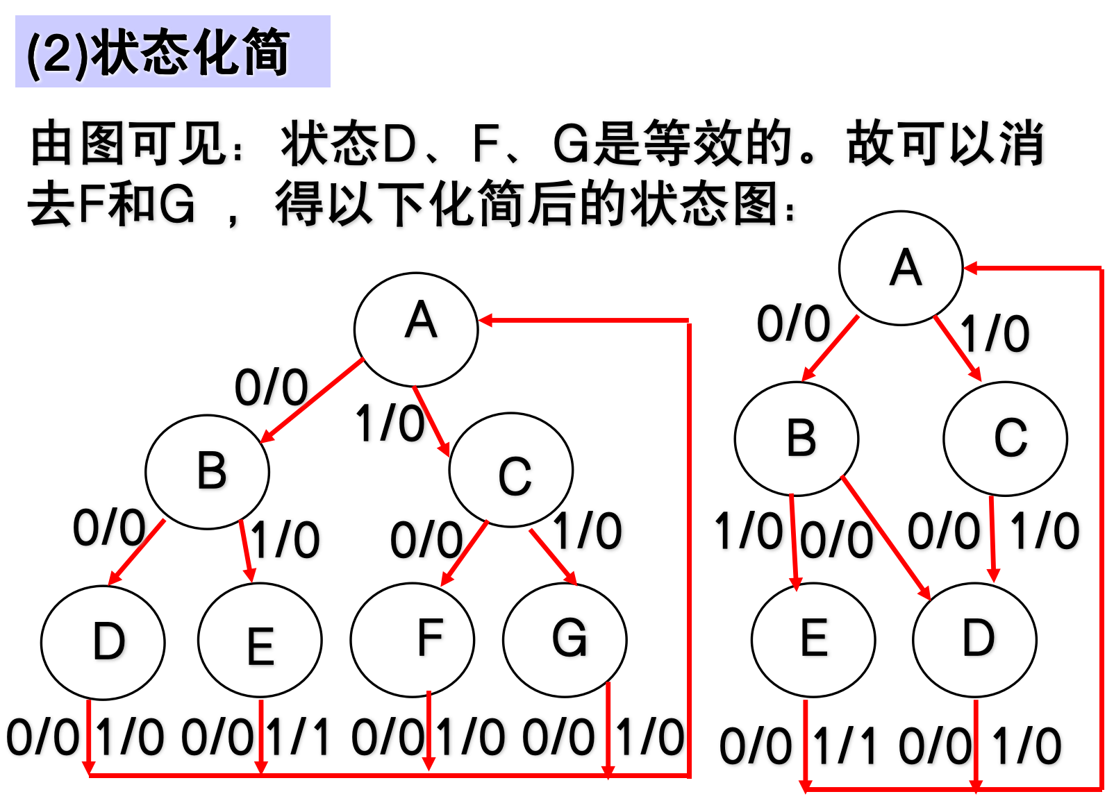 等效状态最简单的判别方法是:"输入相同,输出相同,到达的次态也相同"。