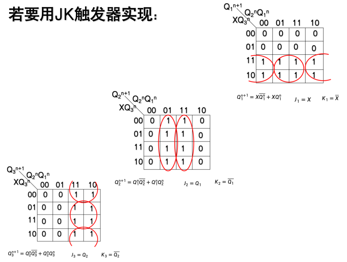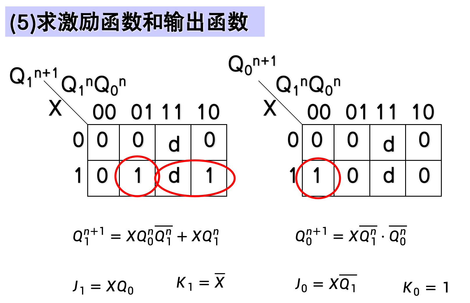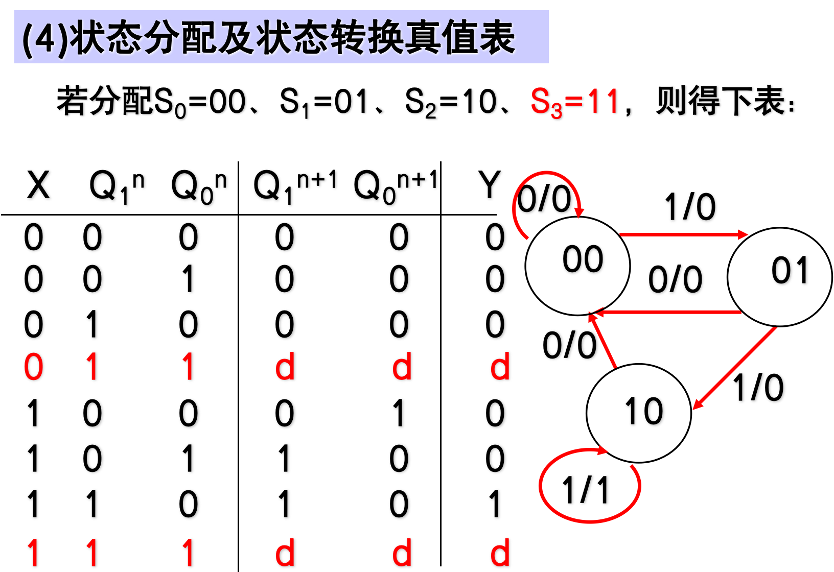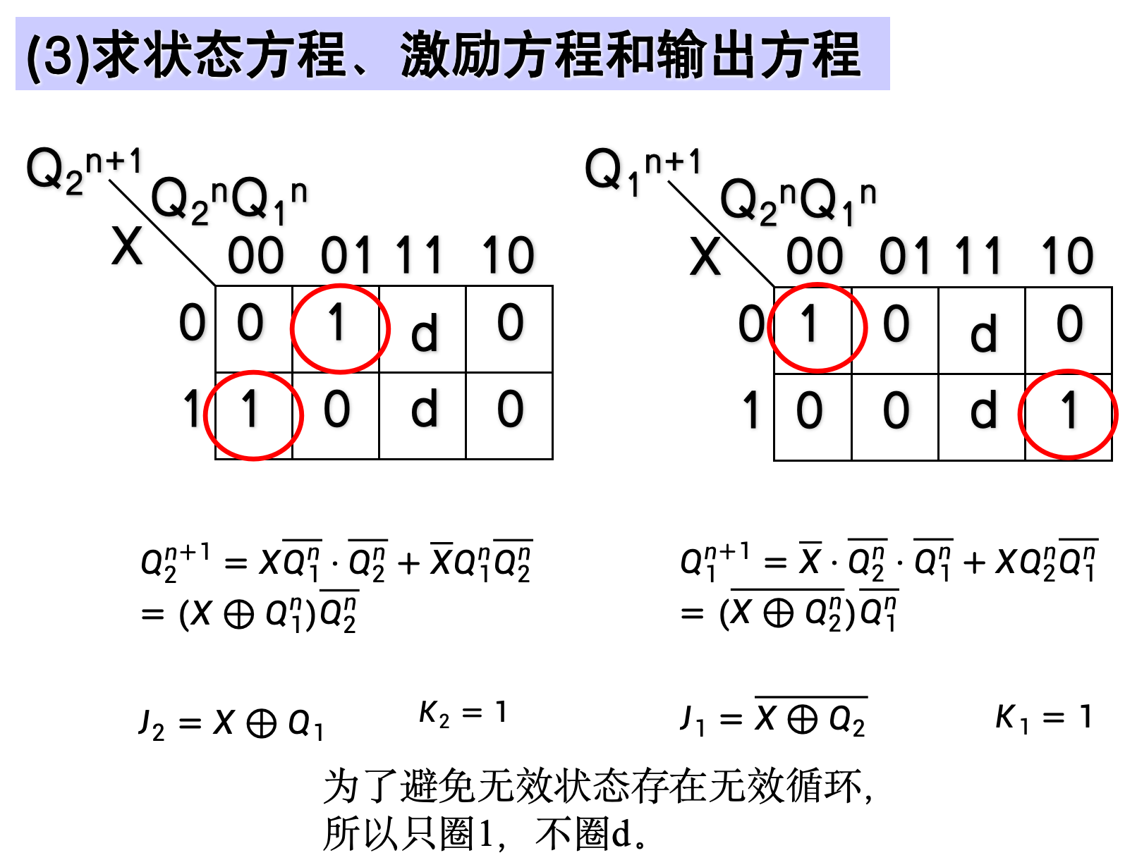 - 这样可以保证相应触发器的激励函数对应的卡诺图中有较多的"1"相邻,有利于激励函数的化简。