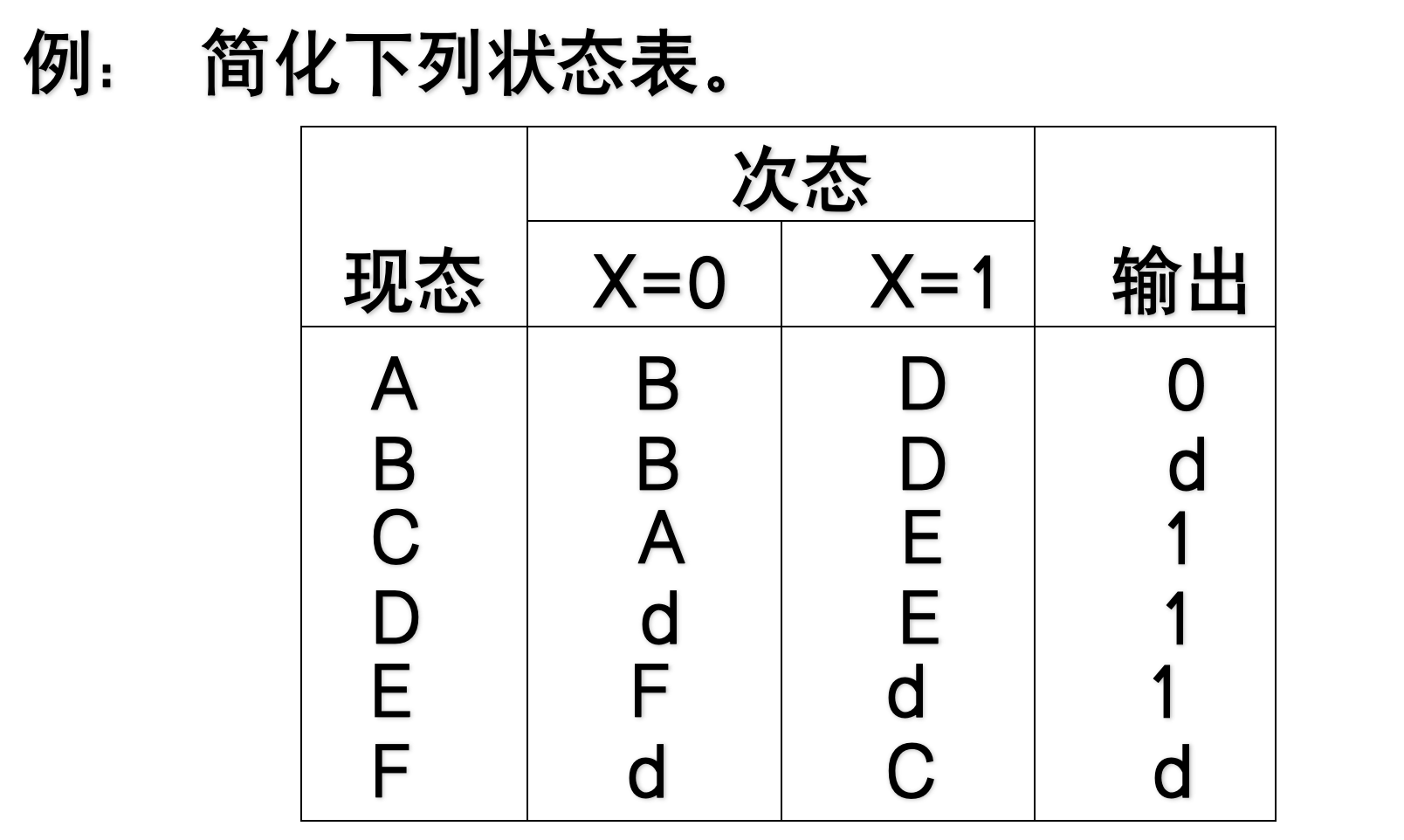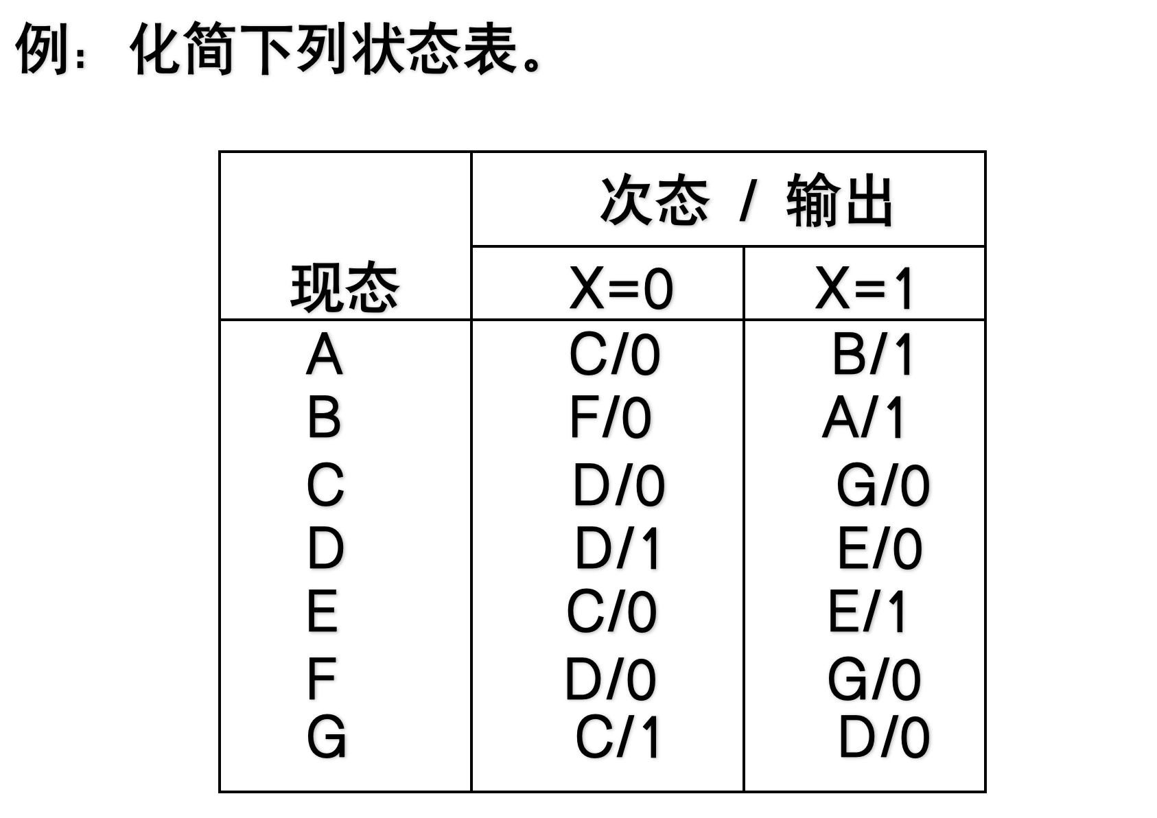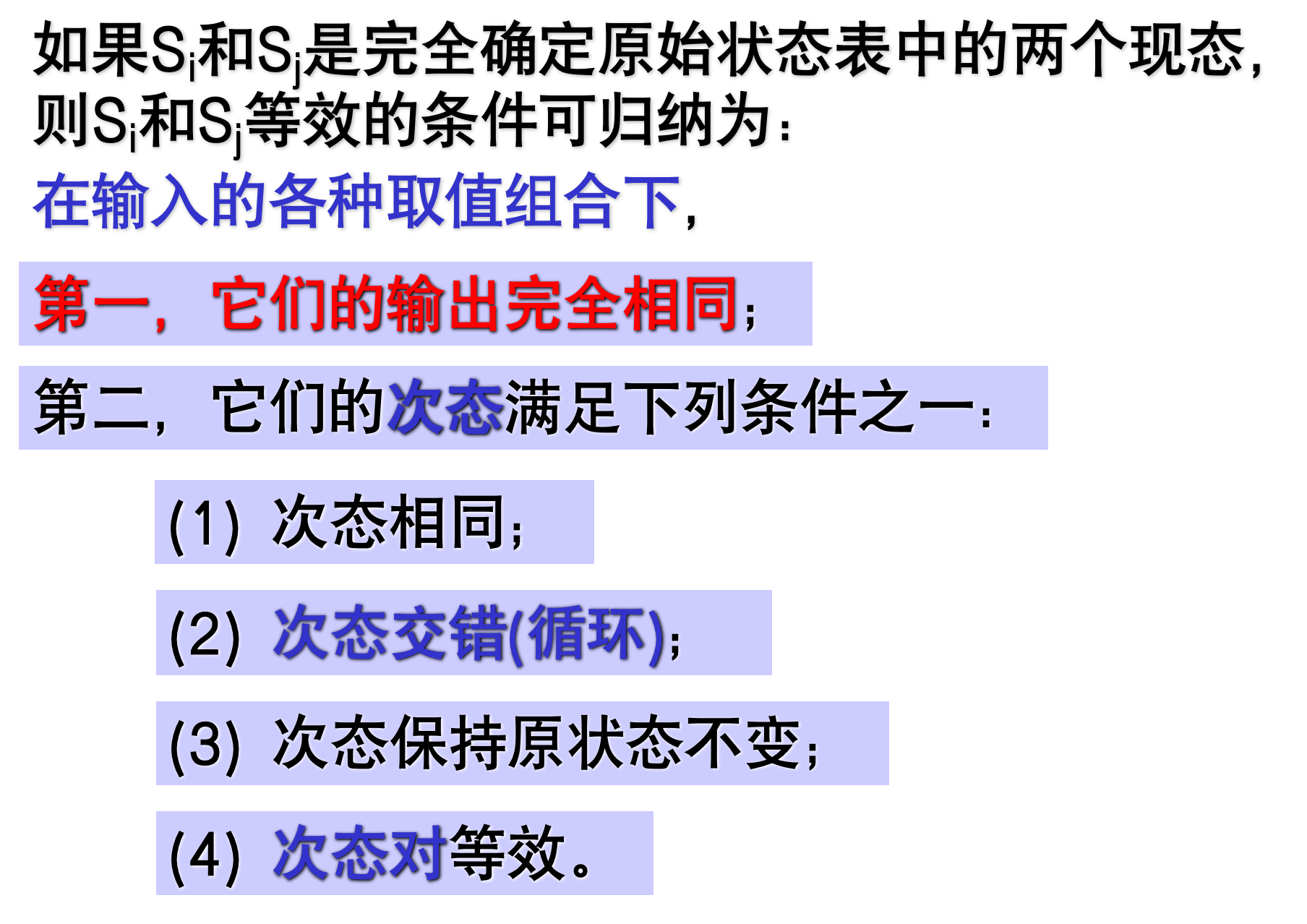 - 设状态S1和S2是完全确定状态表中的两个状态,如果对于所有可能的输入序列,分别从状态S1和S2出发,所得到的输出和次态序列完全相同 ,则状态S1和S2是等效的。
