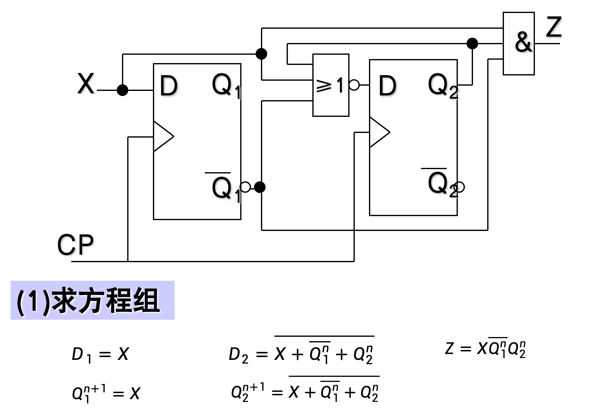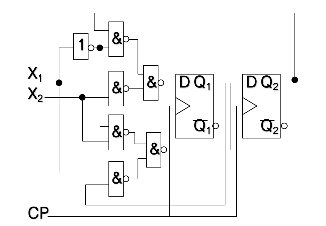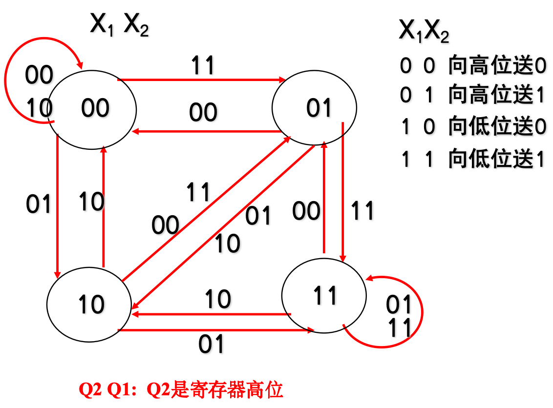 例2 :设计一个两位 串行输入/并行输出双向移位寄存器。该寄存器有X1和X2两个输入,X1控制移位方向,X2用于数据输入。当X1=0时,X2向寄存器高位串行送数,寄存器中的数据从高位移向低位。当X1=1时,X2向寄存器低位串行送数,寄存器中的数据从低位移向高位。(用D触发器实现)