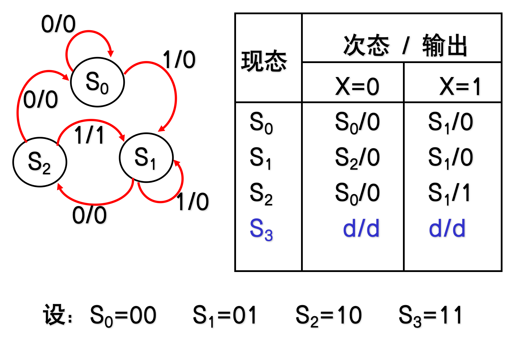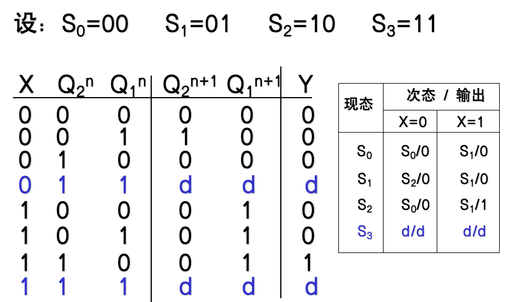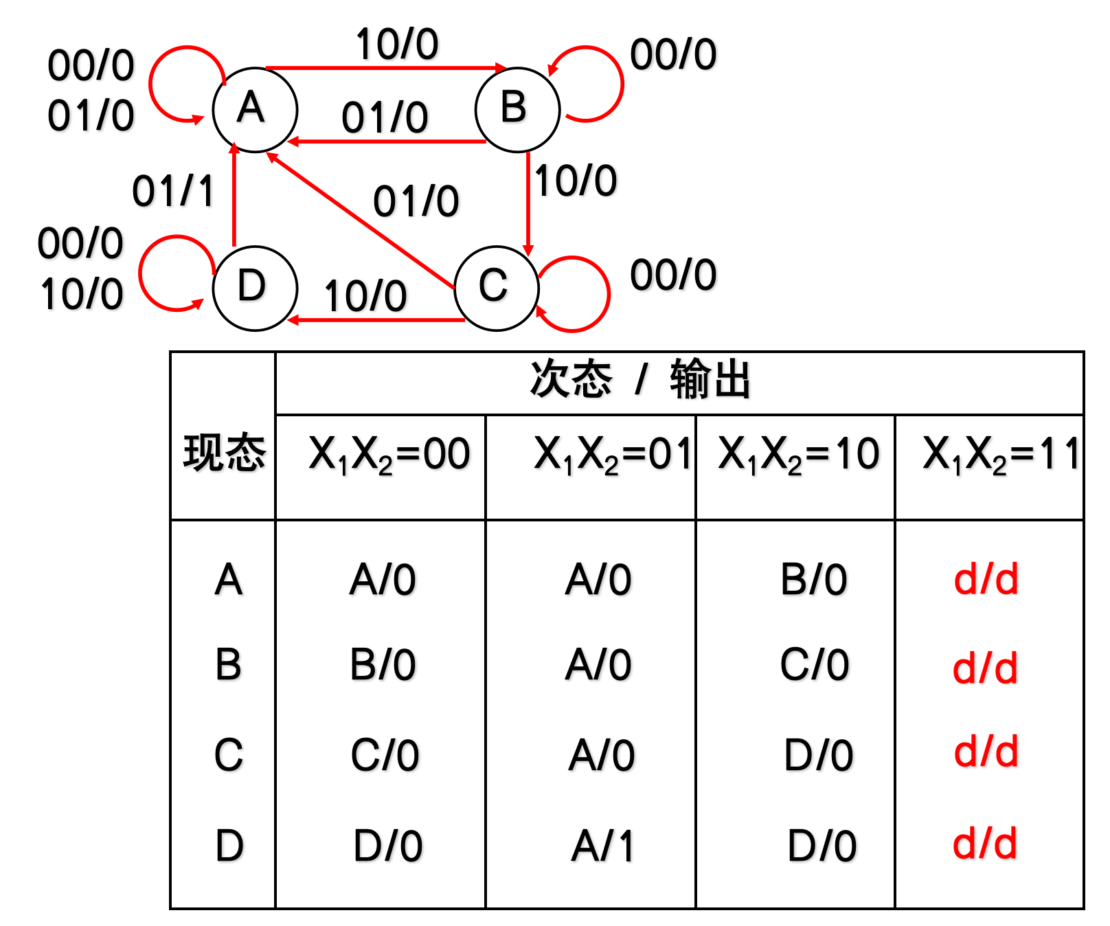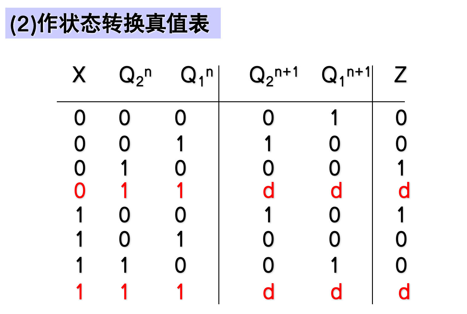 - 存在任意项(或约束项)的状态表称不完全确定状态表,它所描述的电路叫不完全确定电路。