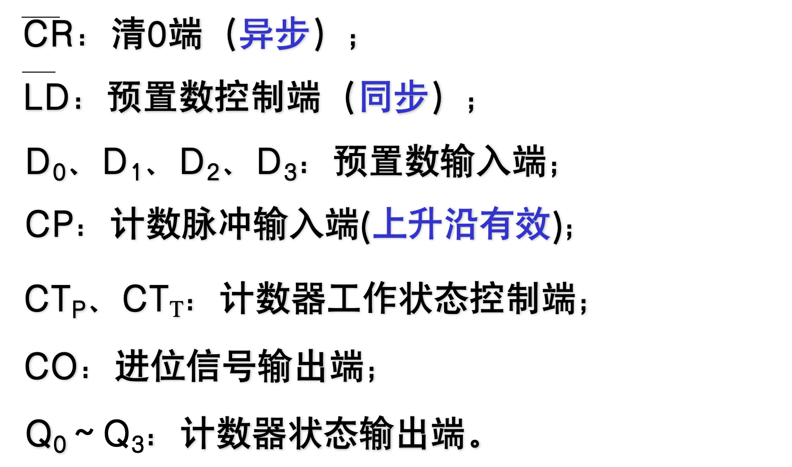 | CT P \text{CT}\text{P} CTP ( ENT P \text{ENT}\text{P} ENTP) | 计数器工作状态控制端 (使能) | 同步 | 功能: 与 CT T \text{CT}\text{T} CTT 配合使用。当 CT P = 1 \text{CT}\text{P}=1 CTP=1 且 CT T = 1 \text{CT}_\text{T}=1 CTT=1 时,计数器在 CP 上升沿到来时执行加法计数。 |