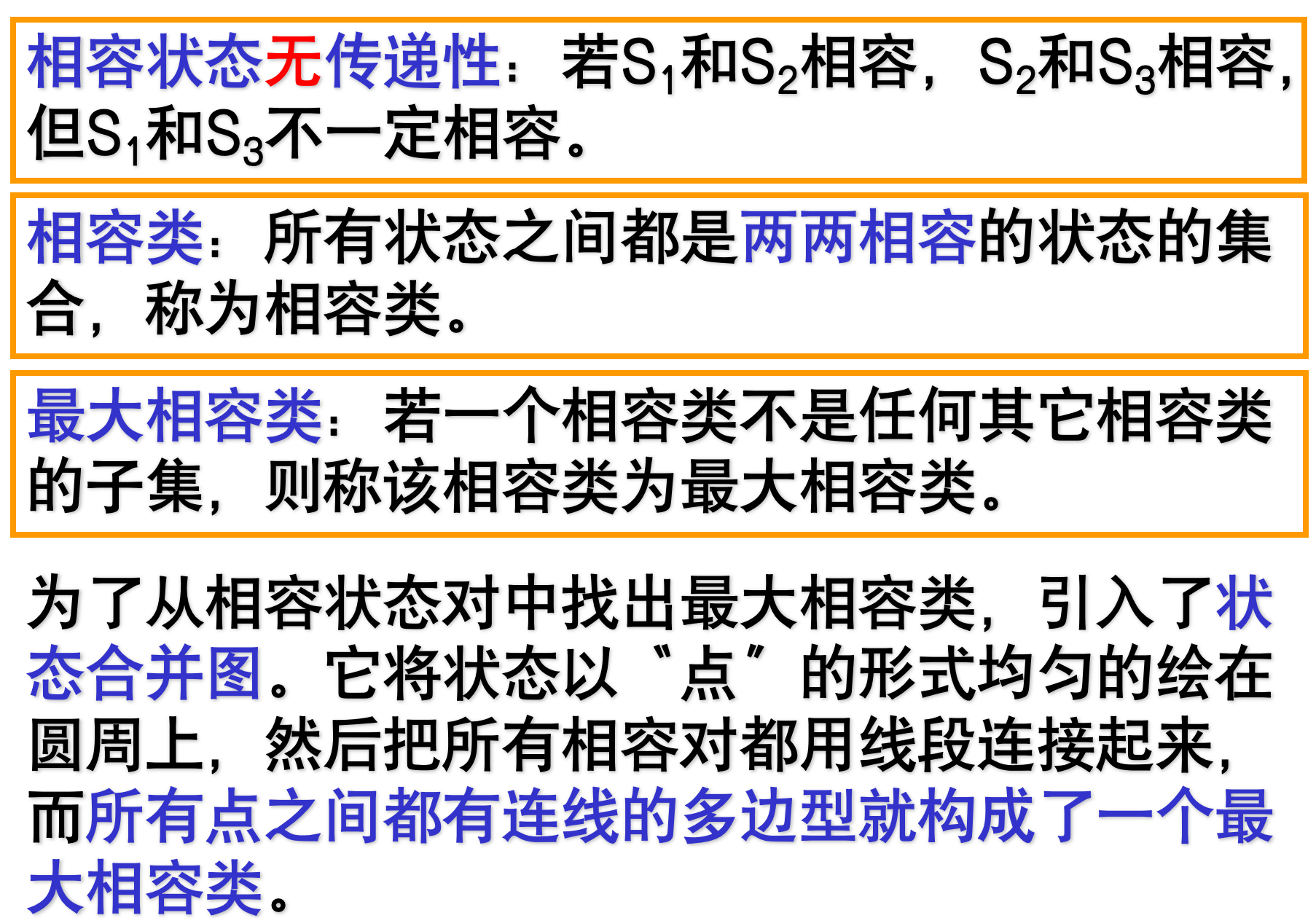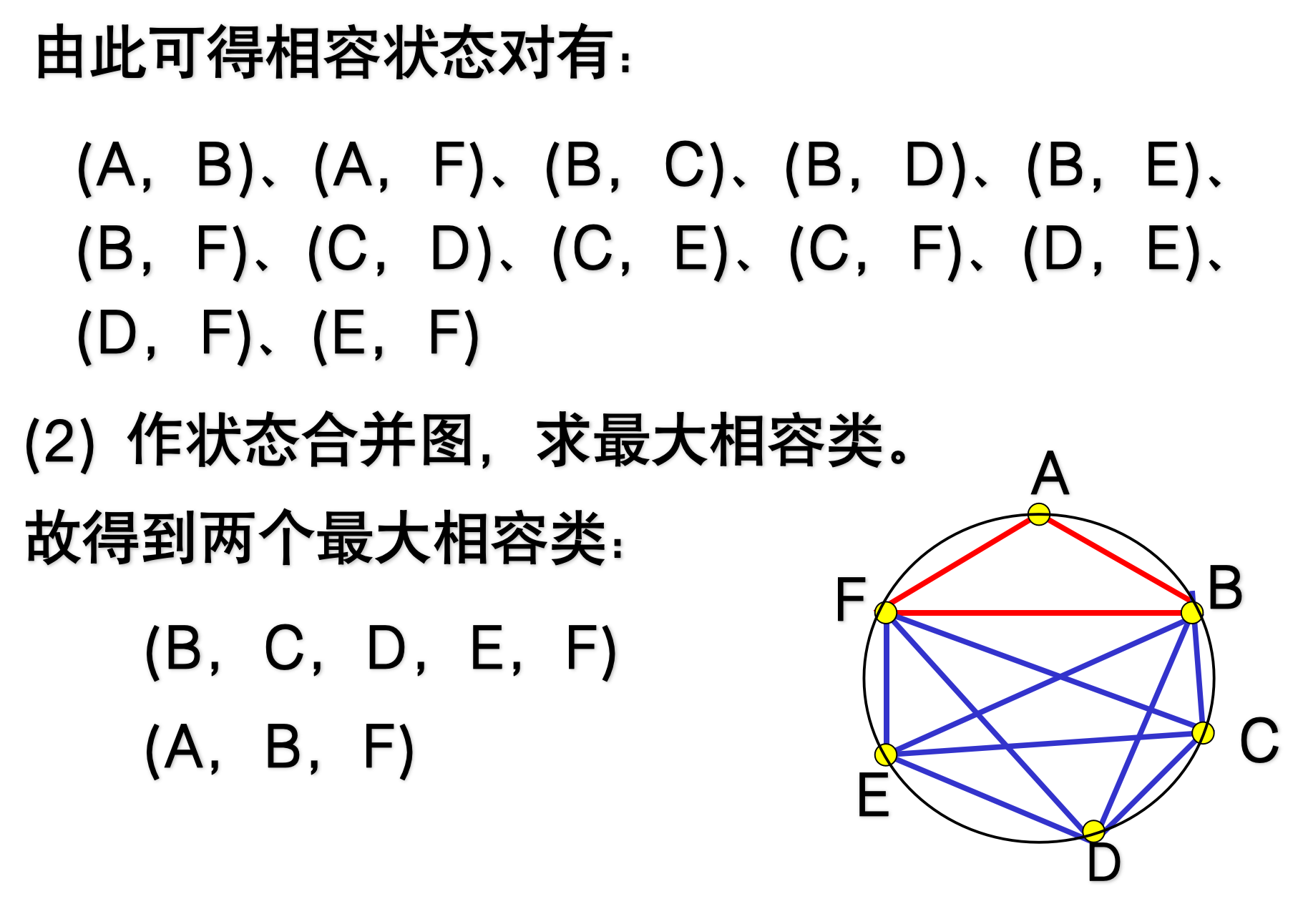 - 覆盖性:即所选的相容类的集合应包含原始状态表中的全部状态。