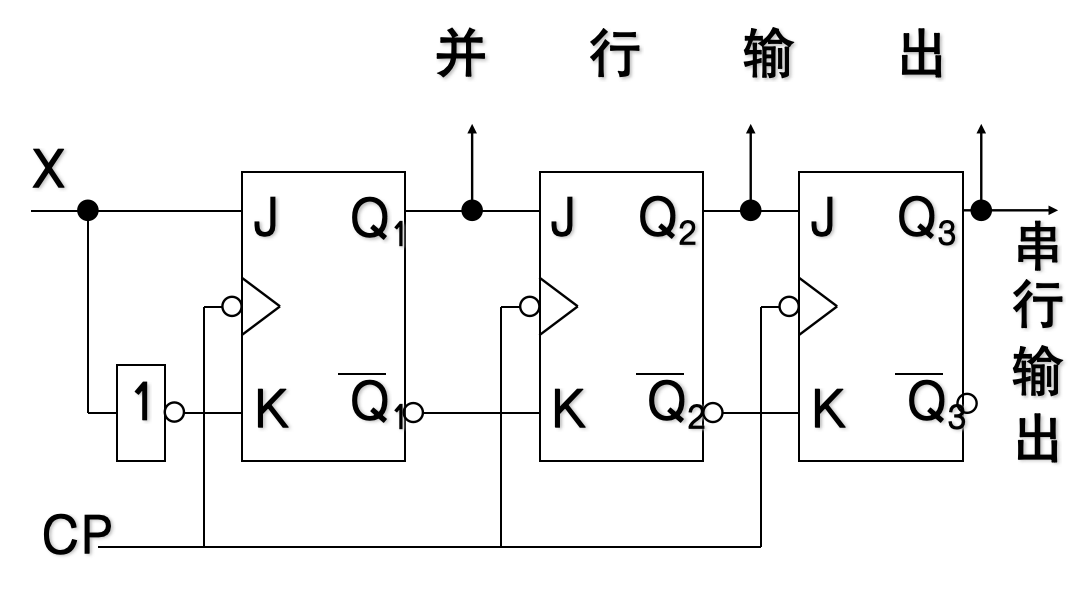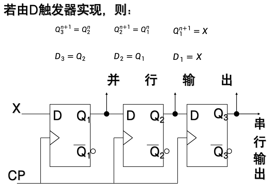 例1:试设计一个三位串行输入/串行输出的移位寄存器,输入信号由低位到高位依次进行,输入端为X。