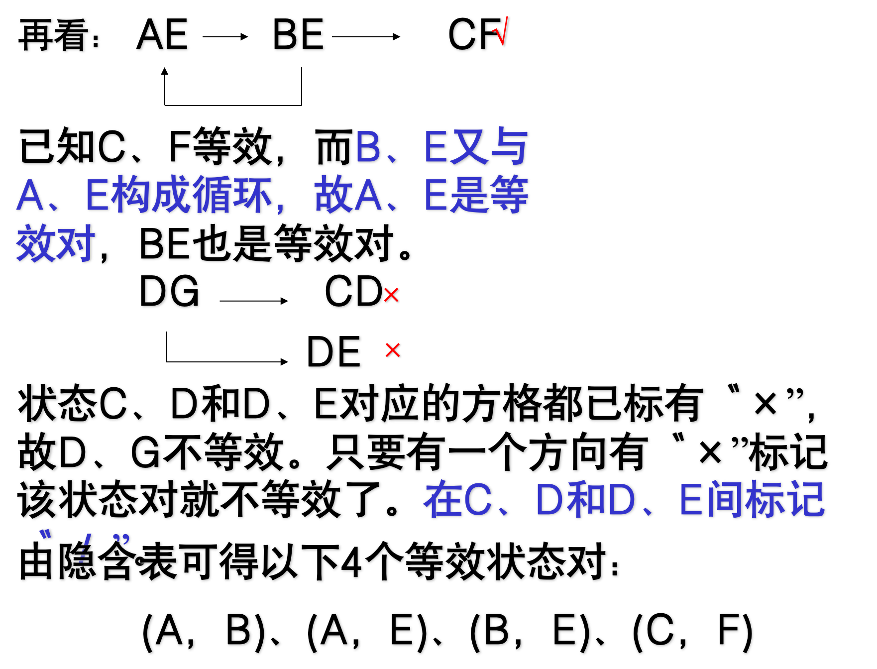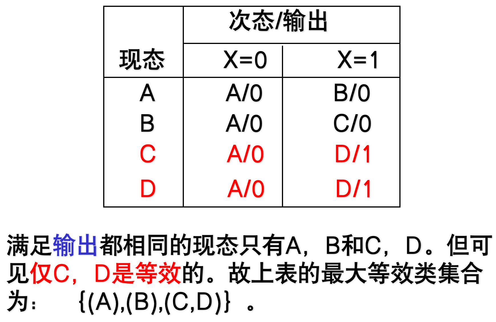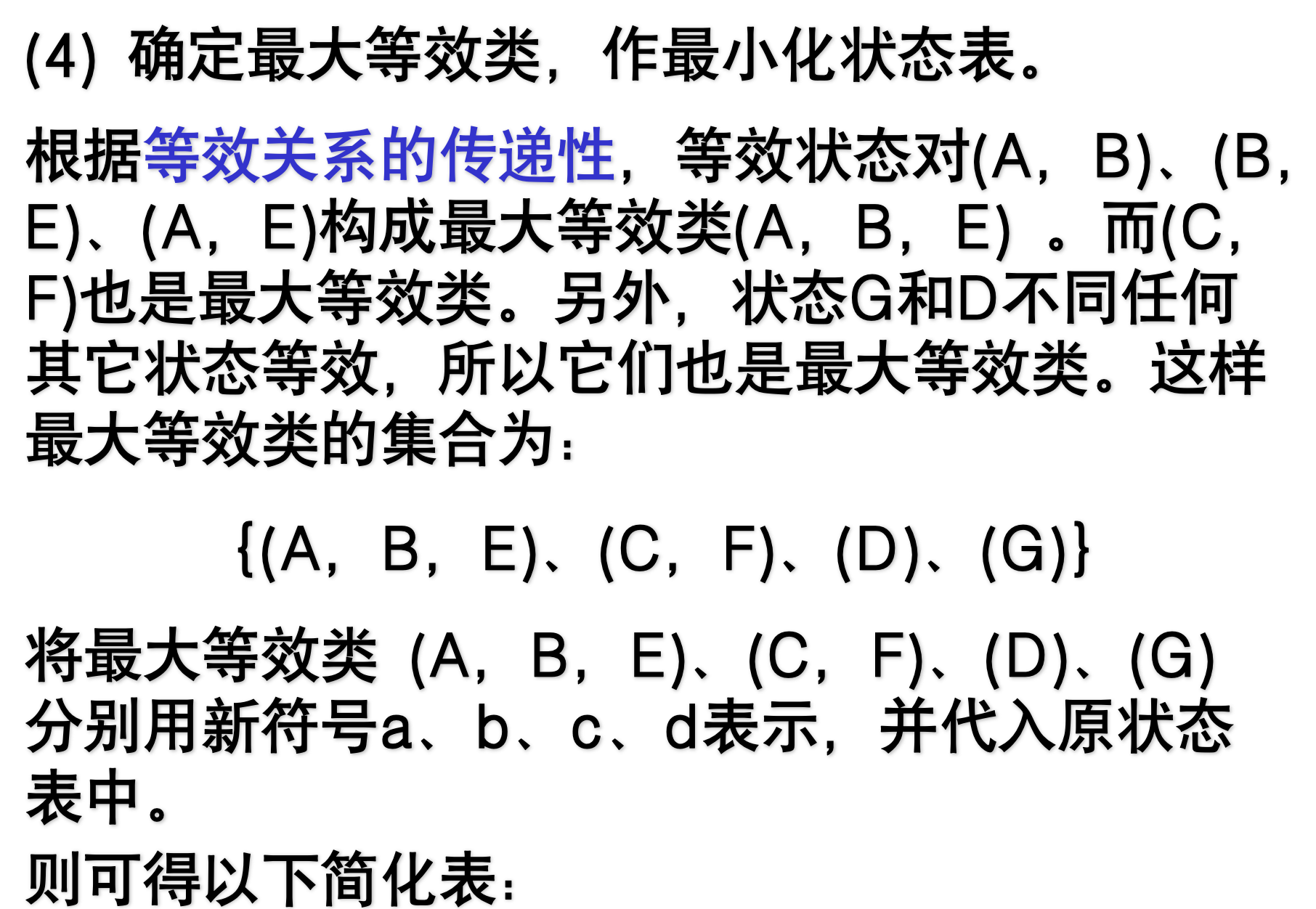 - 利用等效状态的传递性得到等效类和最大等效类;