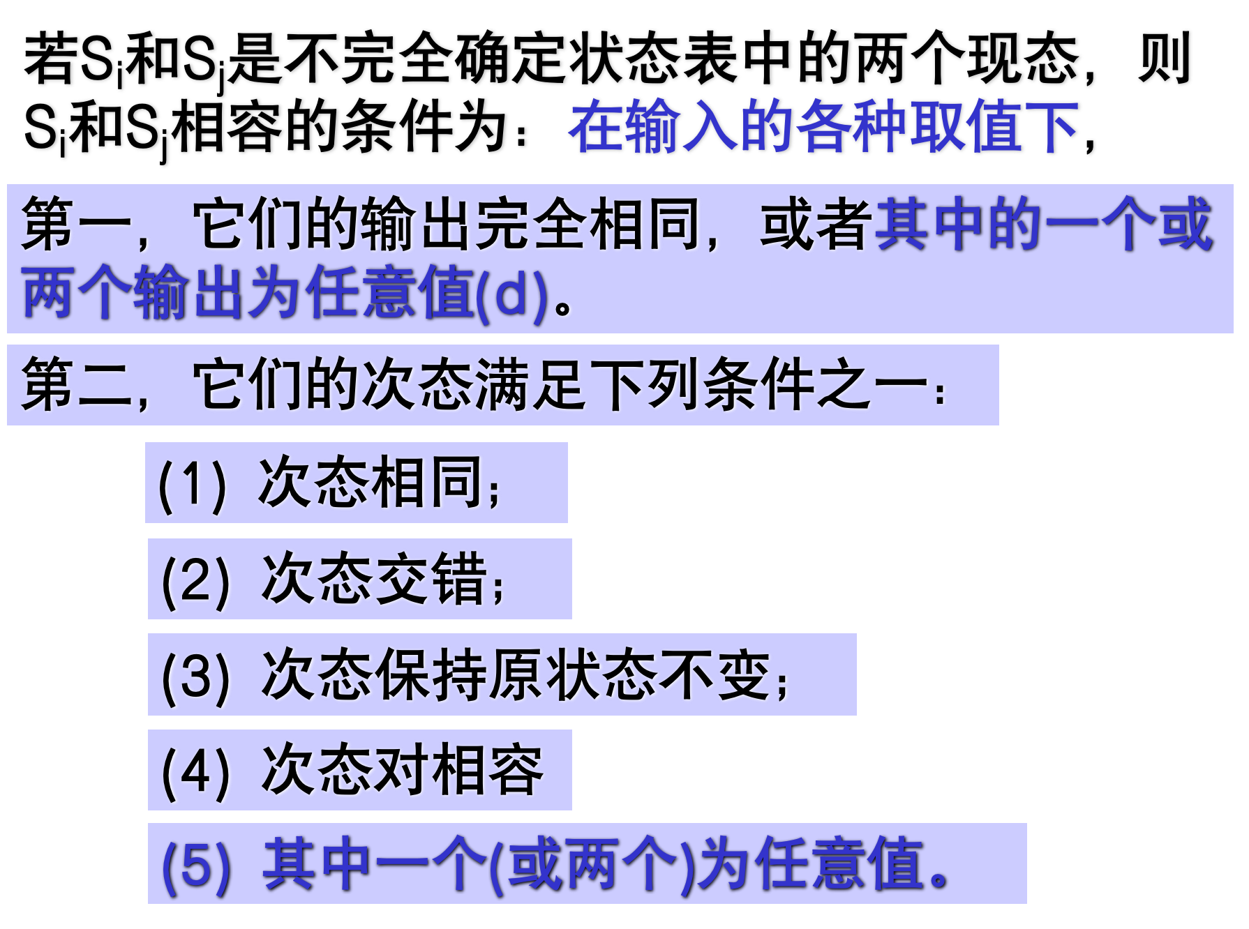 相容状态 :设S1和S2是不完全确定状态表中的两个状态,如果对于所有的有效输入序列,分别从S1和S2出发,所得到的输出响应序列和次态(++除不确定的那些位外++)是完全相同的,则S1和S2是相容的。