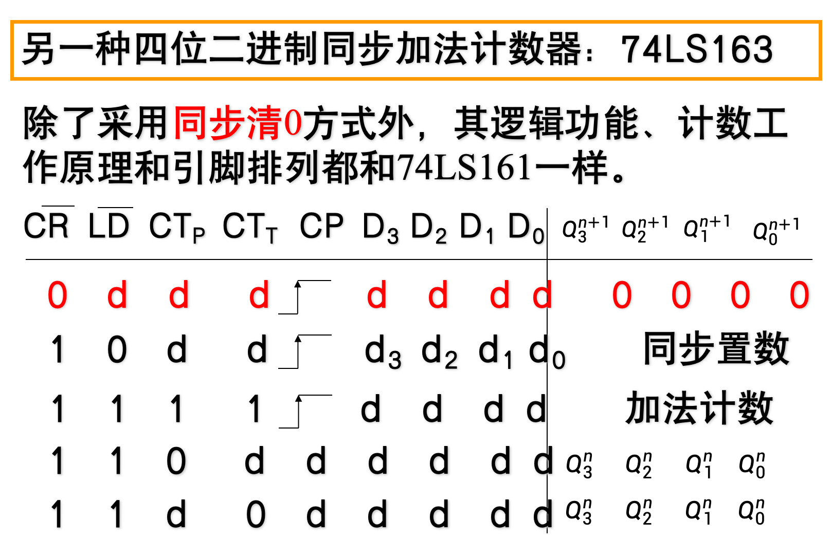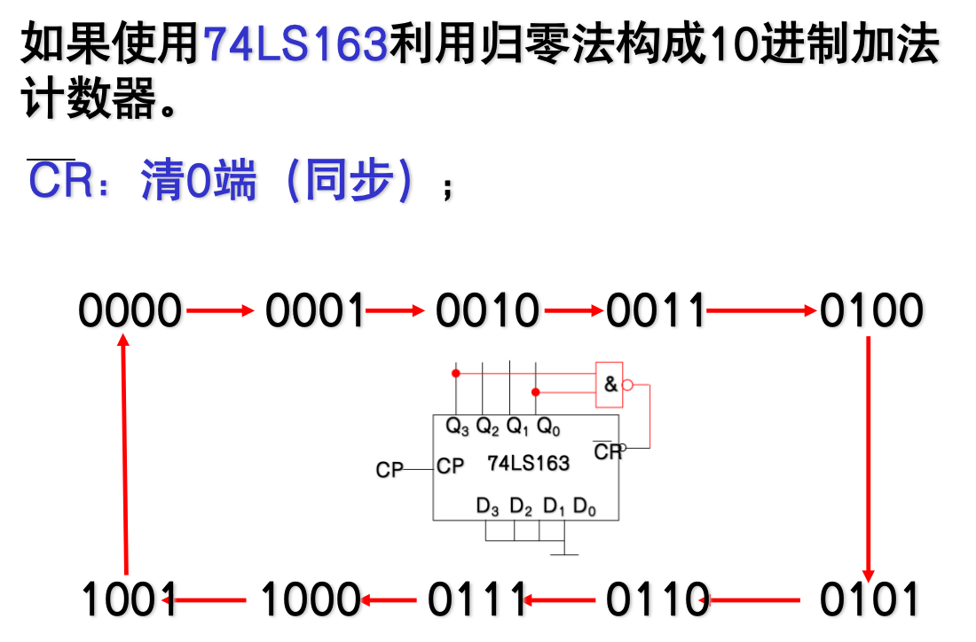 - 74LS163 的CR端是同步高电平有效------当CR=0,需要等待到下一个CP上升沿,才能将Q1-4置0