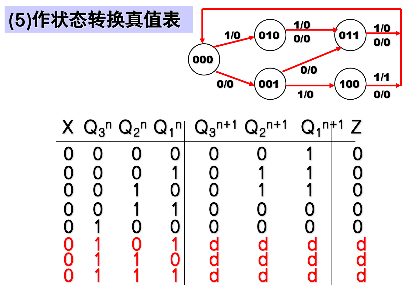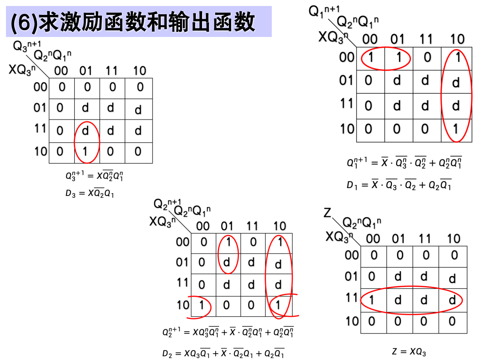 - 这里无效状态有错误输出是因为在关于输出的卡诺图化简的时候把输出为d也圈进来了