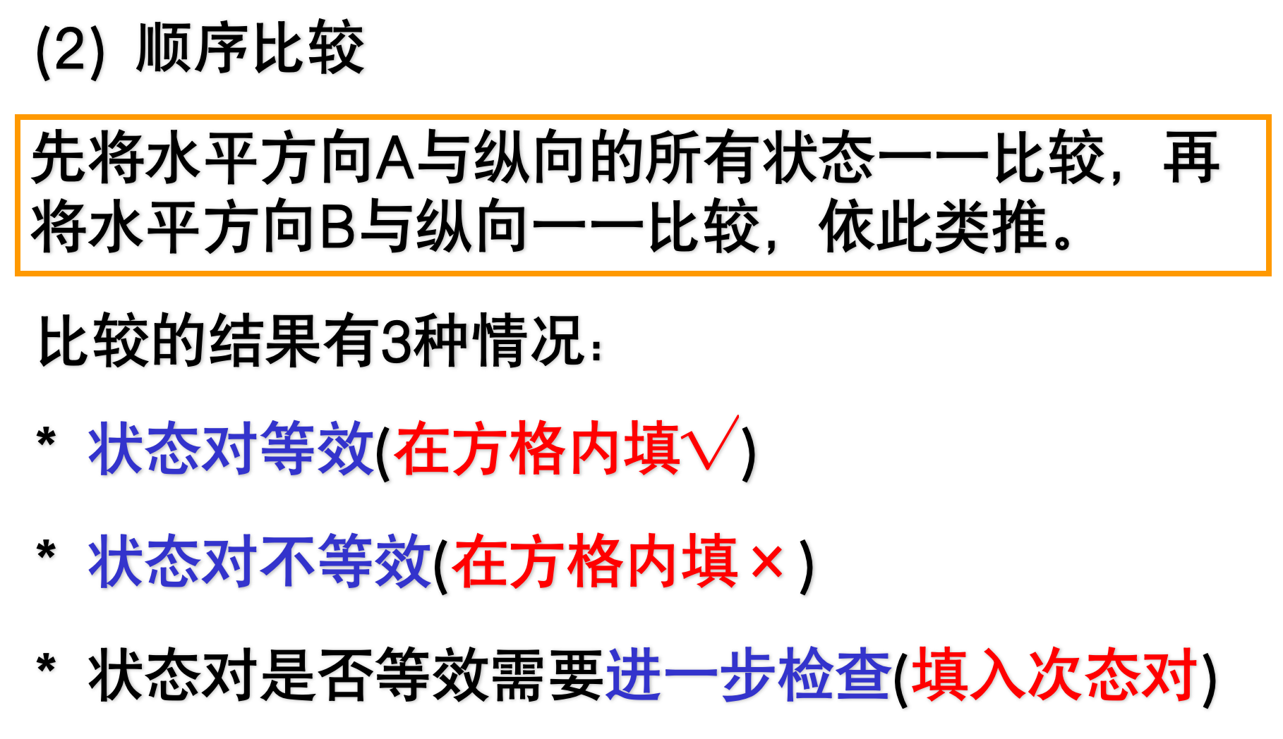 - 对原始状态表中的所有状态两两比较,找出等效状态对;