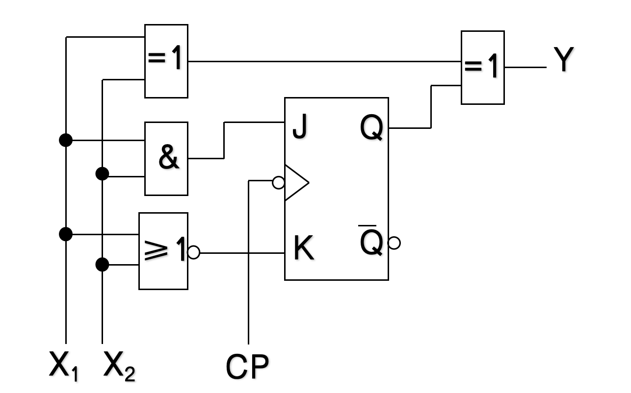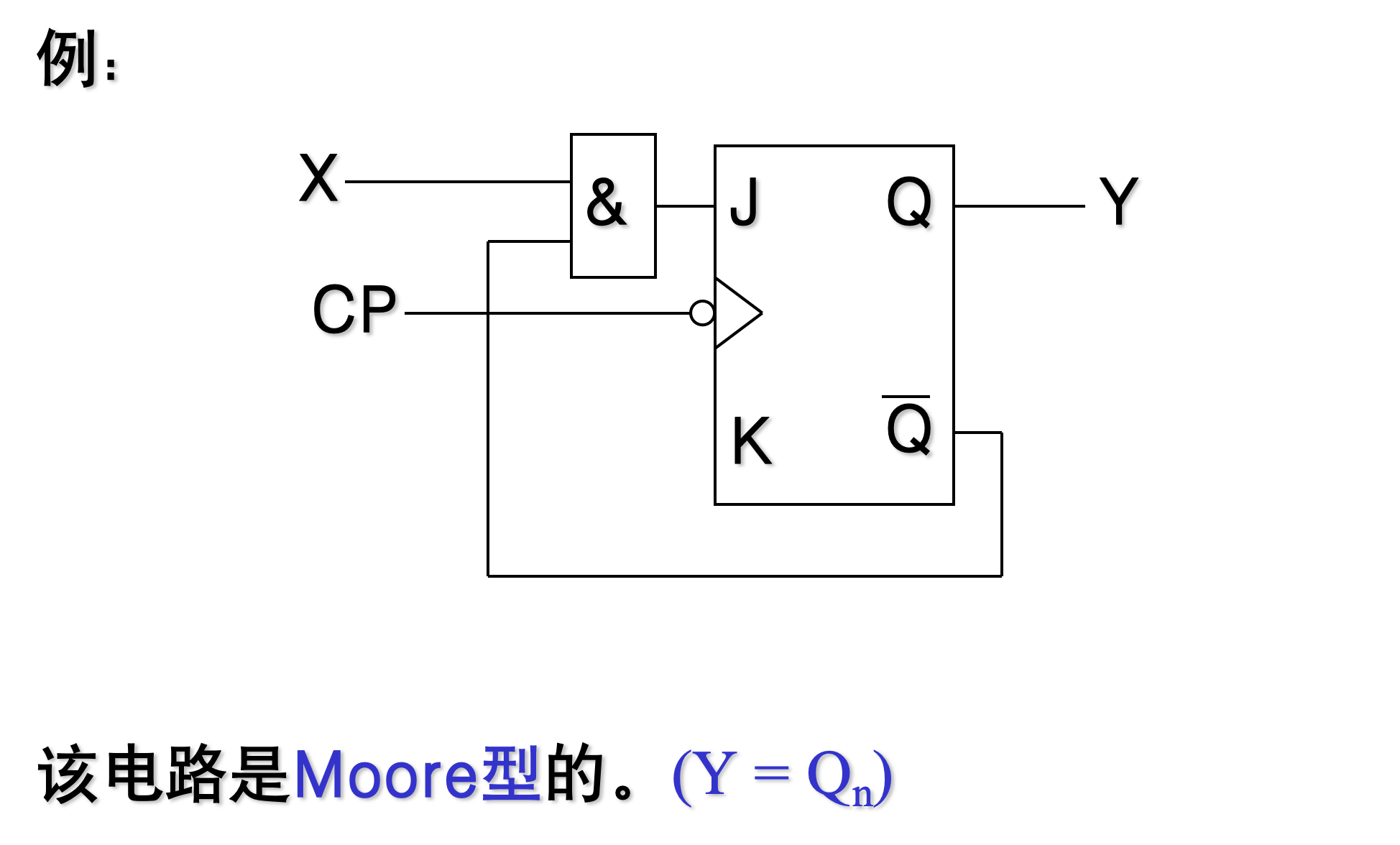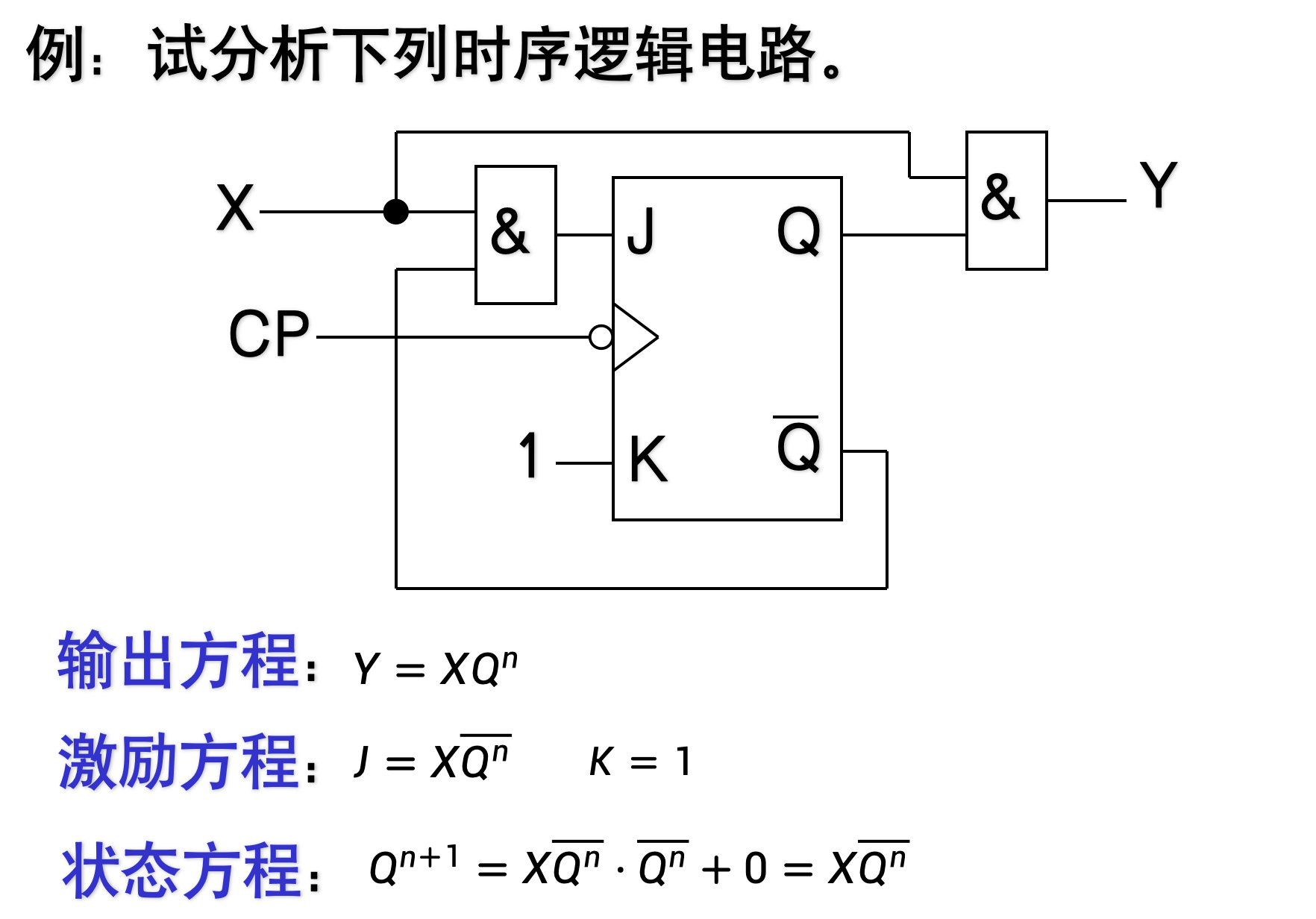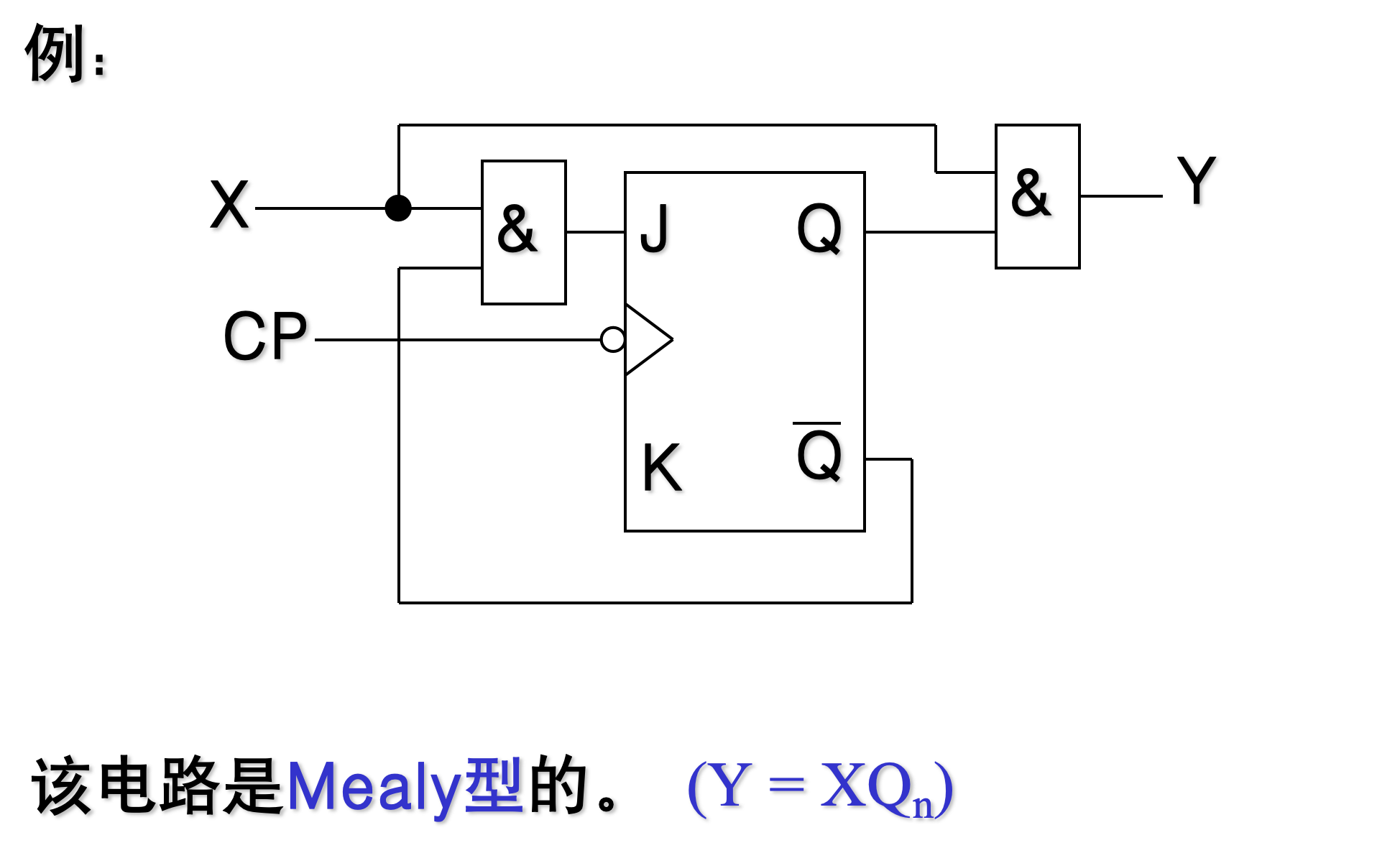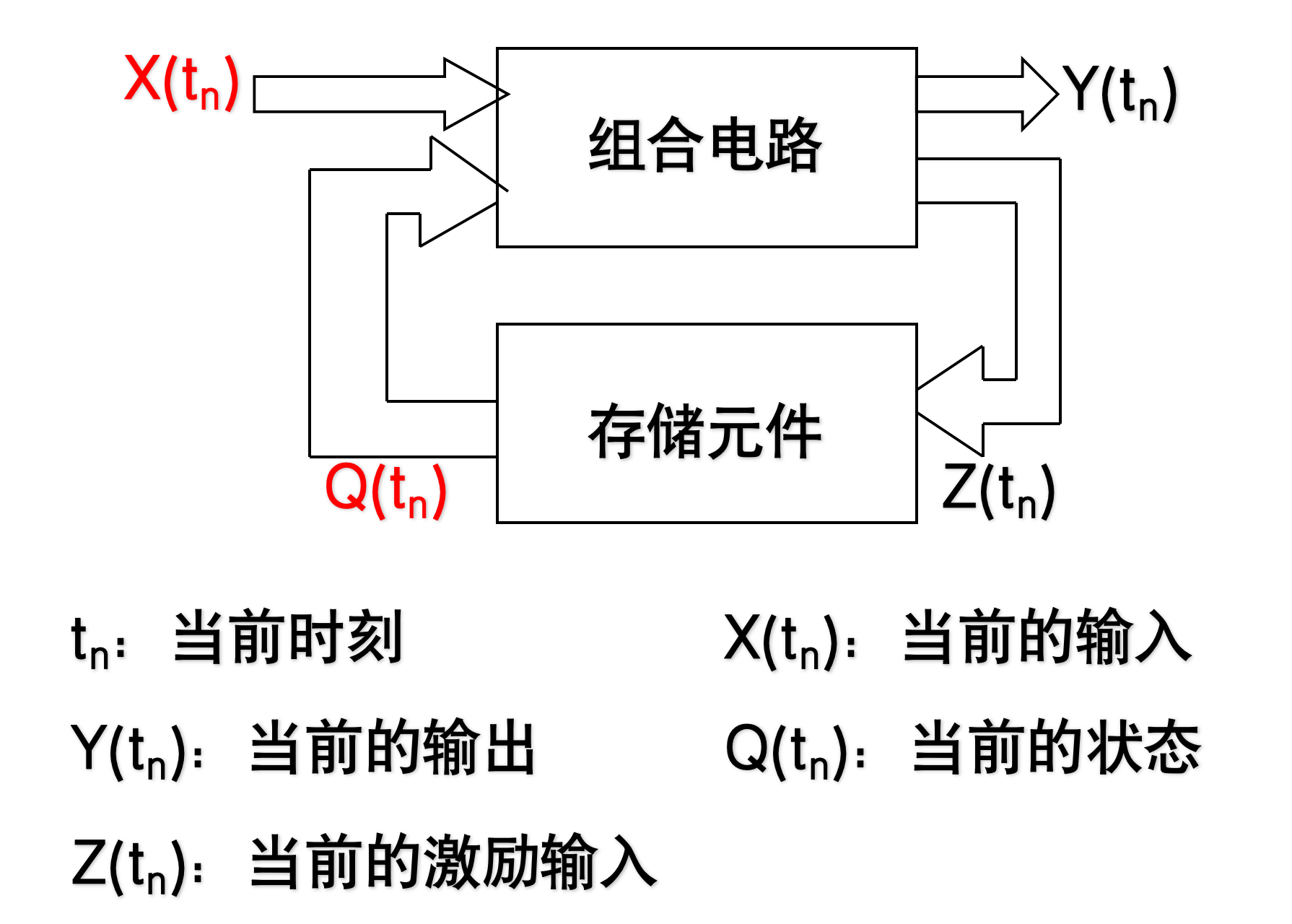 - 任一时刻的输出既与即刻输入有关(若有输入),还与电路当时的状态有关(和以前的输入有关)。