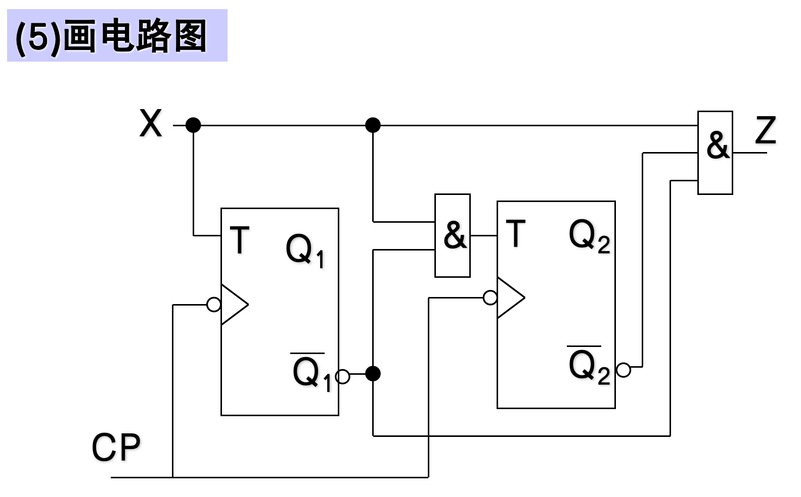 例:试设计一个两位的二进制减法计数器,由输入X控制,X=0状态不变;X=1在CP的作用下作减法计数。