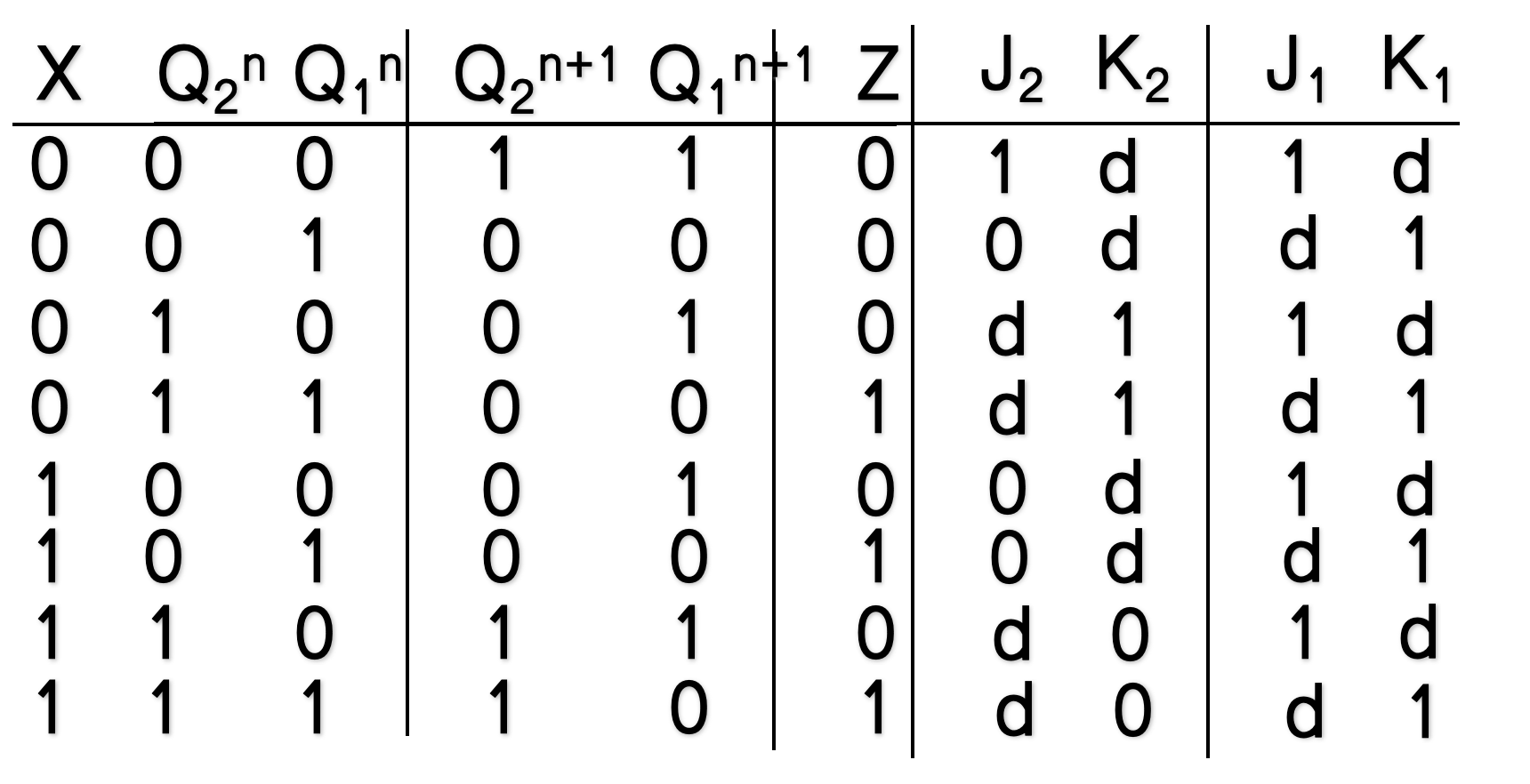 例:试用JK触发器设计一个三进制可逆计数器。当X=0时,作加法计数;当X=1时作减法计数。若计数时产生进位或借位输出Z=1,否则Z=0。