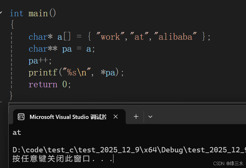 //解引用二级指针,将'a'地址传给printf向后打印字符串,直到遇见\0