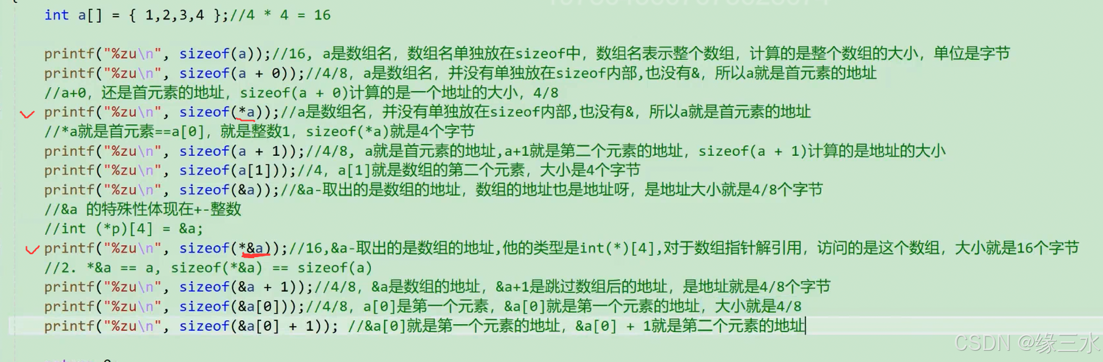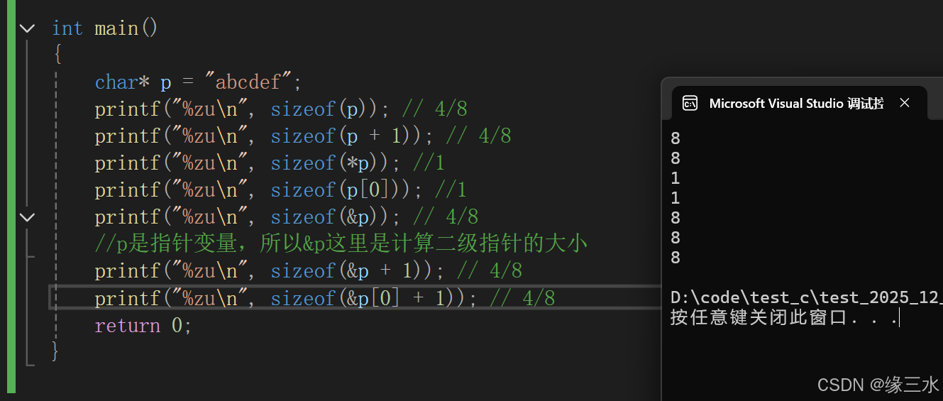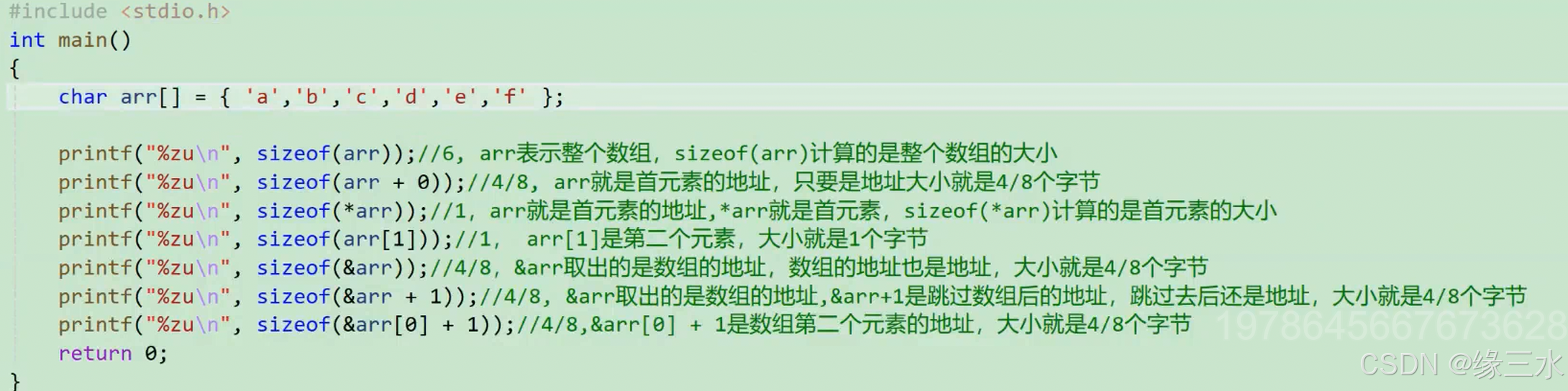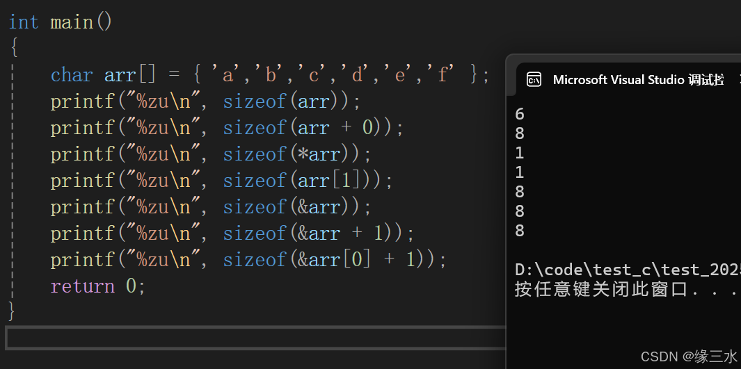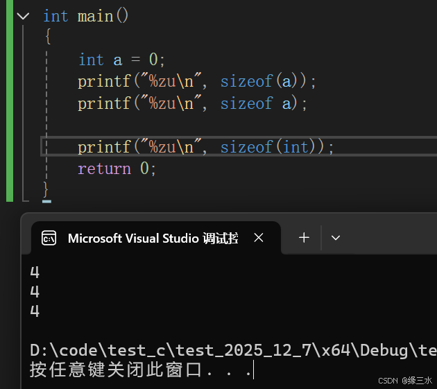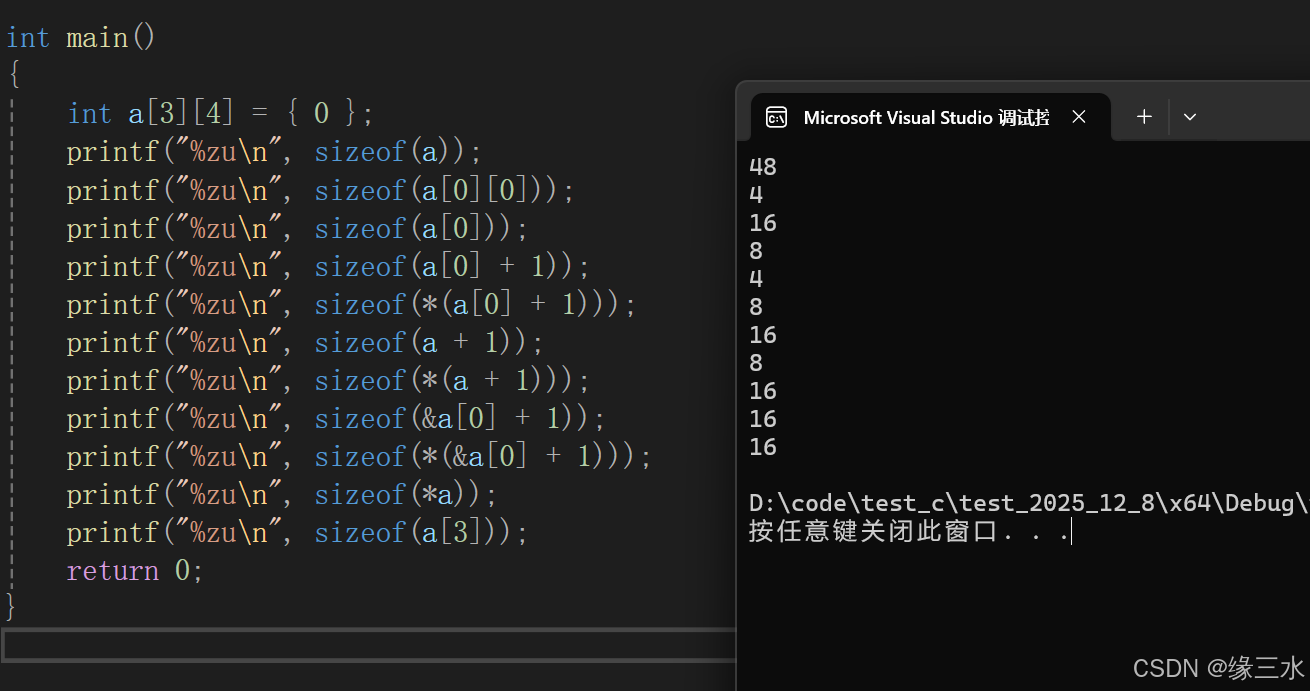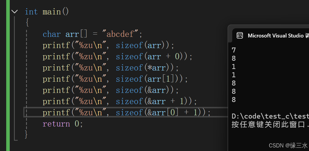 //数组名a并没有单独放在sizeof里,所以代表的是首元素地址,计算的大小就是首元素地址的大小,由环境决定,我的环境是x64,因此计算出8