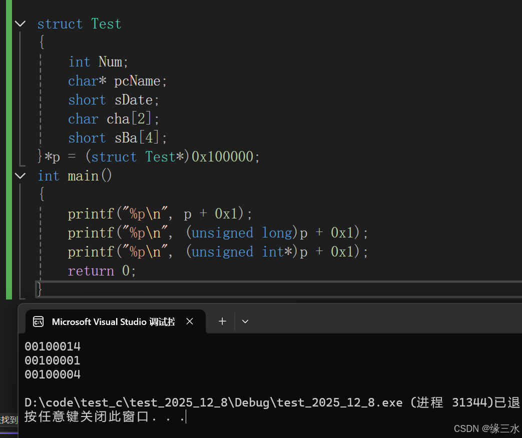 }*p = (struct Test*)0x100000;//利用这个结构体创建一个指针变量p,将0x100000这个16进制整型强制类型转换成大小为20字节的结构体类型