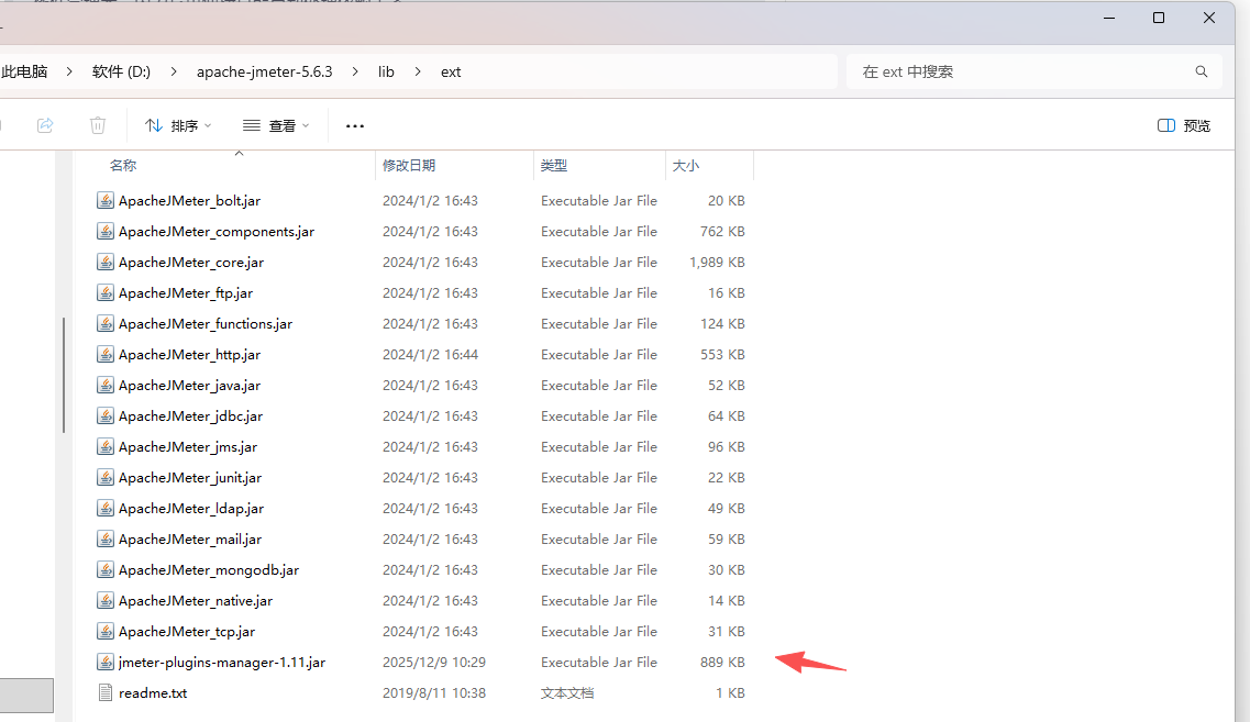 02 将plugins-manager.jar放入JMeter的lib/ext目录下。(即手动下载安装步骤)