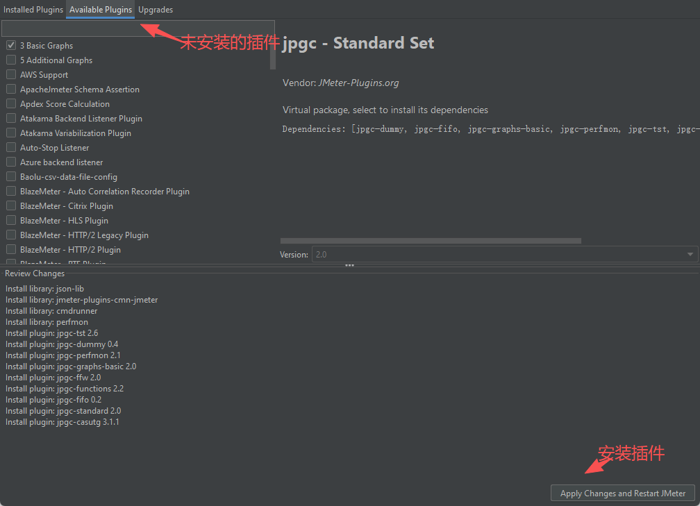 Upgrades(可更新的插件):即可以更新到最新版本的一些插件,一般显示为加粗斜体,可以通过点击截图右下角的Apply Changes and Restart Jmeter按钮来下载更新;