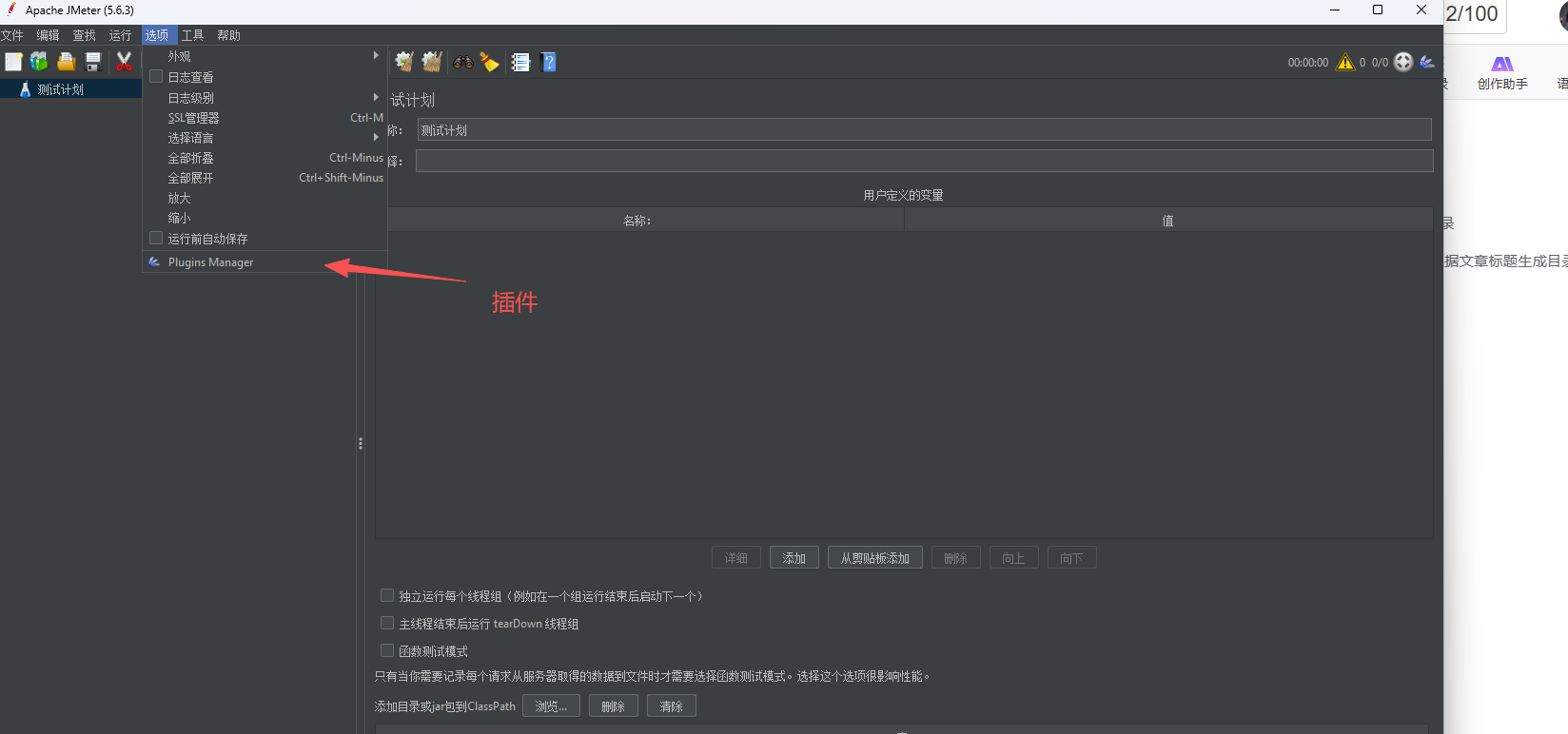 03 重启jmeter,在选项菜单中可以看到"Plugins Manager"。