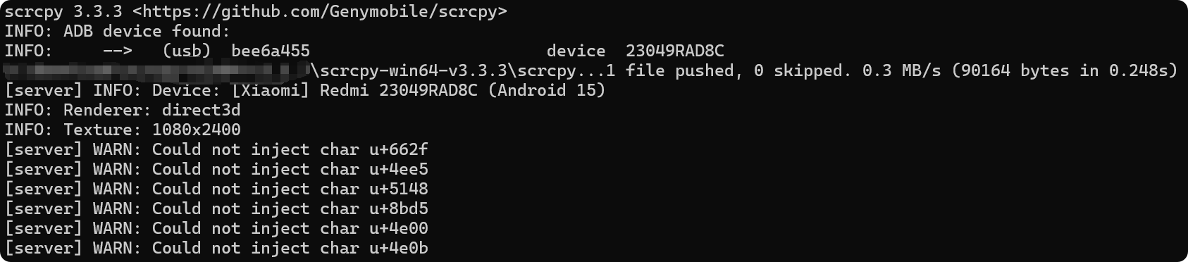 adb devices确认设备识别后,运行../scrcpy-win64-v3.3.3/scrcpy-console.bat。 -
