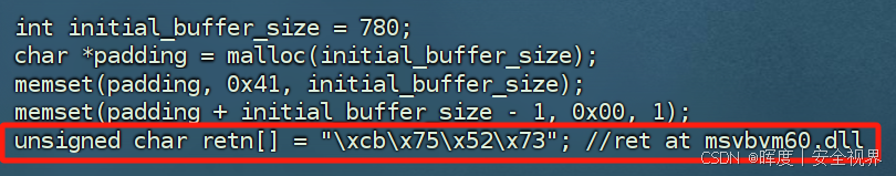 使用 memset 将 padding 指向的内存区域的前 780 字节全部填充为 0x41。0x41 是ASCII码中的字符 'A',所以这行代码是将这块内存区域填充为字母 'A'。 |