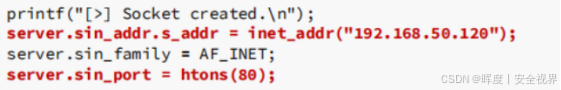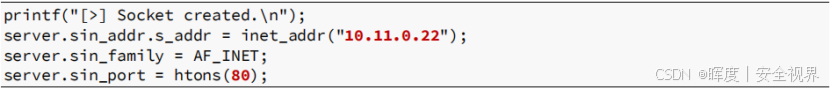问题 :C代码中使用了硬编码的IP地址和端口,必须调整为实际目标信息。