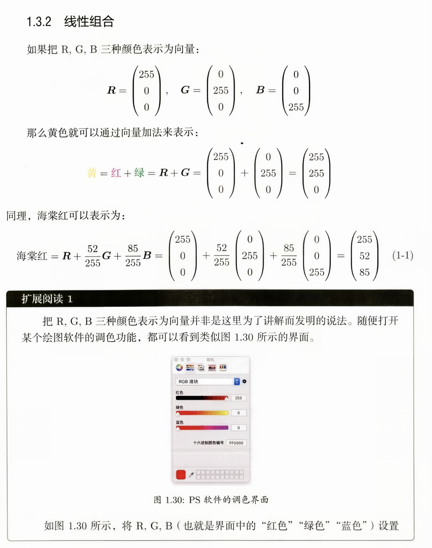 - 线性组合:任何颜色(向量)都可以表示为这三个基向量的线性组合(即数乘后再相加)。这正是您图片中的公式: 海棠红 = 1 * R + (52/255) * G + (85/255) * B