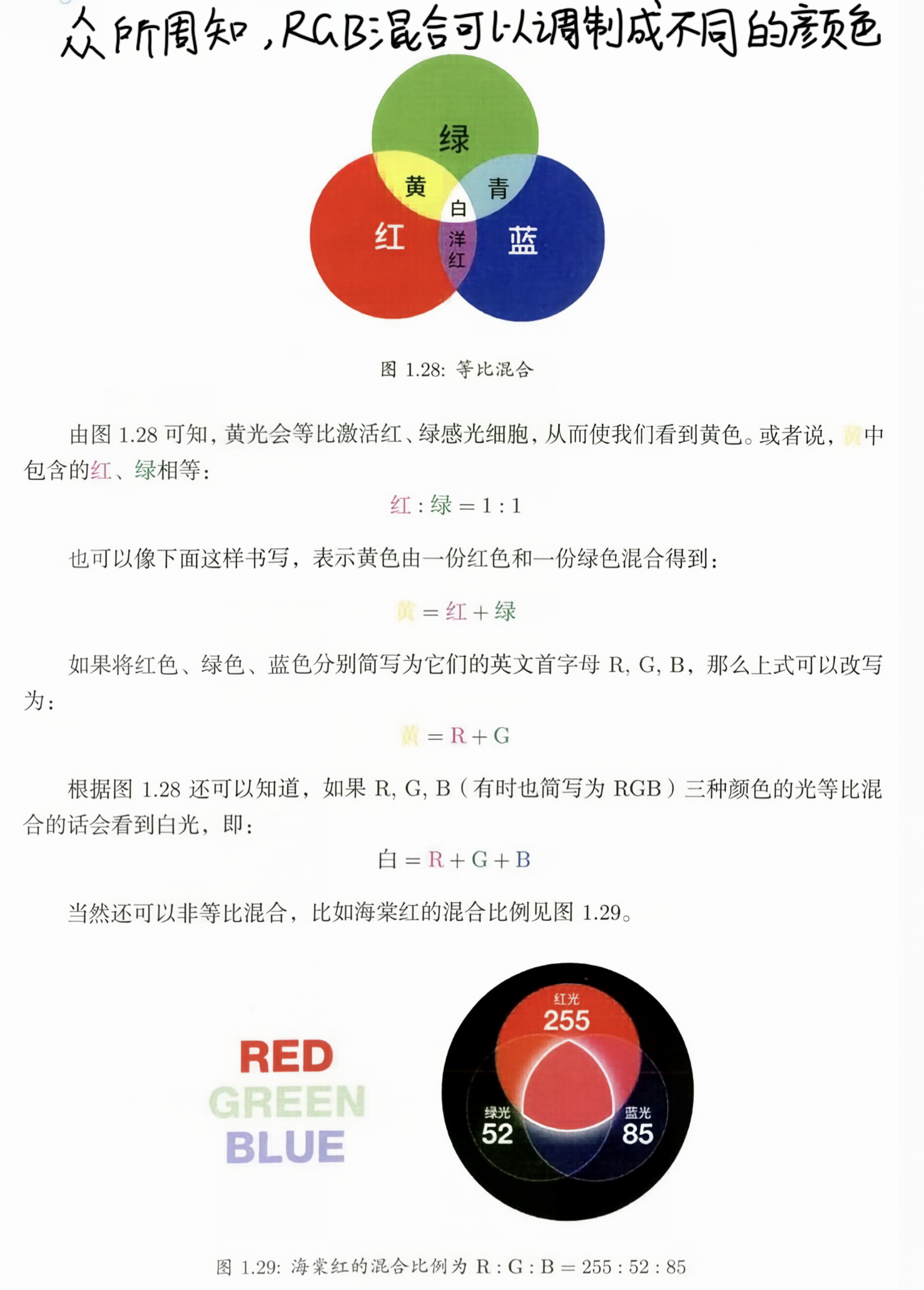 - 物理对应:在显示器上,每个像素点正是通过调节R、G、B三个子像素的亮度(即对基向量进行"数乘"),然后将光混合(即"向量加法")来产生最终颜色的。