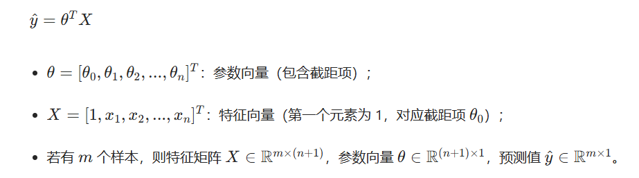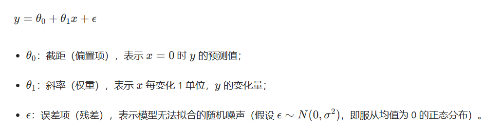当只有一个自变量 ( x ) 时,线性回归假设因变量 ( y ) 与 ( x ) 满足线性关系: