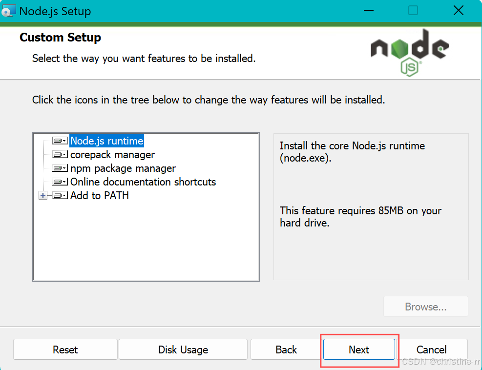 - 勾选 npm package manager(必选,Node.js 自带的包管理工具)