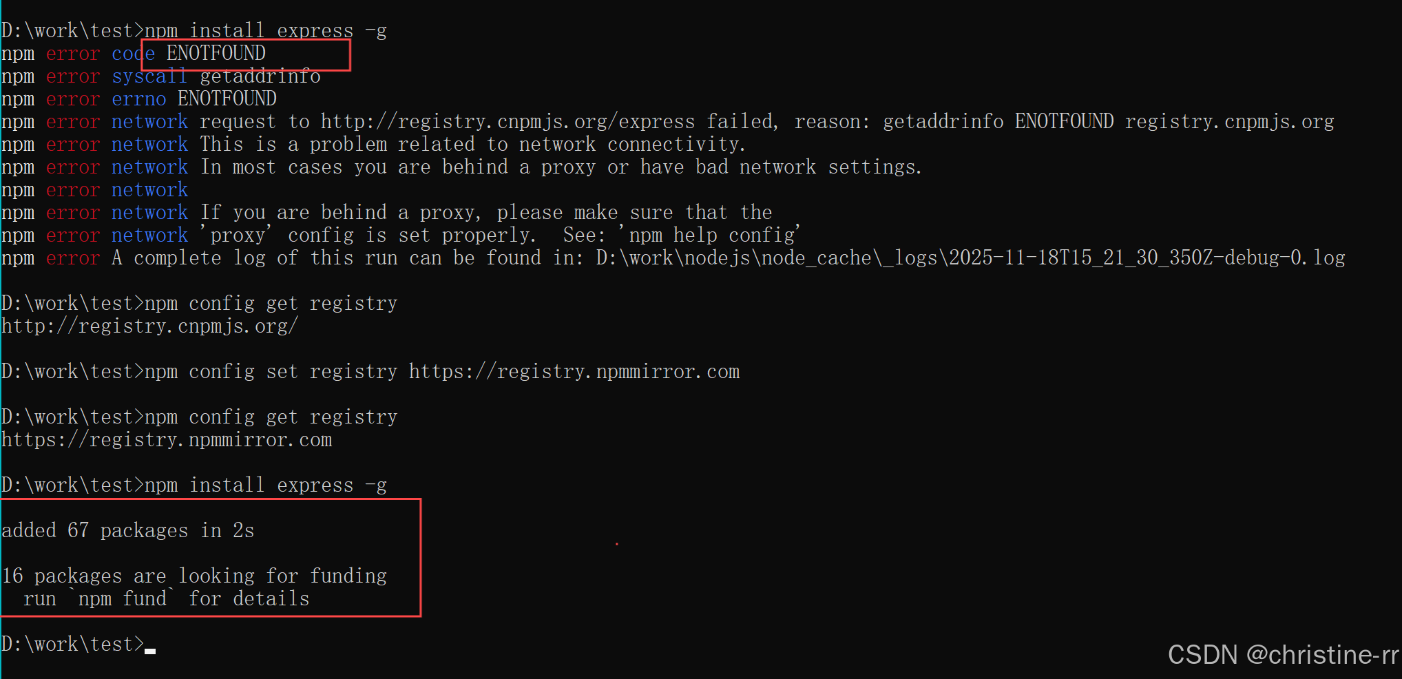 npm install express -g会出现网络连接或 npm 镜像源配置上(ENOTFOUND表示无法找到指定的镜像源地址),这时候就可以更换镜像源。