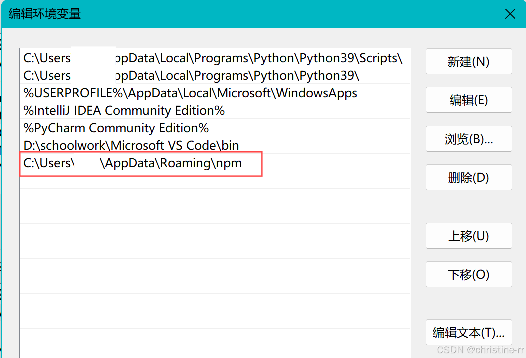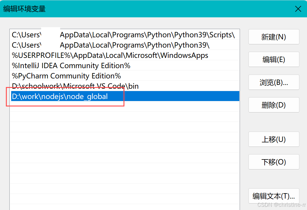 Path,编辑并将原来的C:\Users\用户名\AppData\Roaming\npm替换为你设置的node_global路径(如D:\work\nodejs\node_global)。