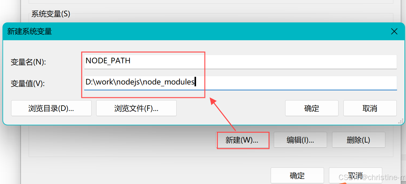 NODE_PATH,变量值为node_global下的node_modules路径(如D:\work\nodejs\node_global\node_modules)。