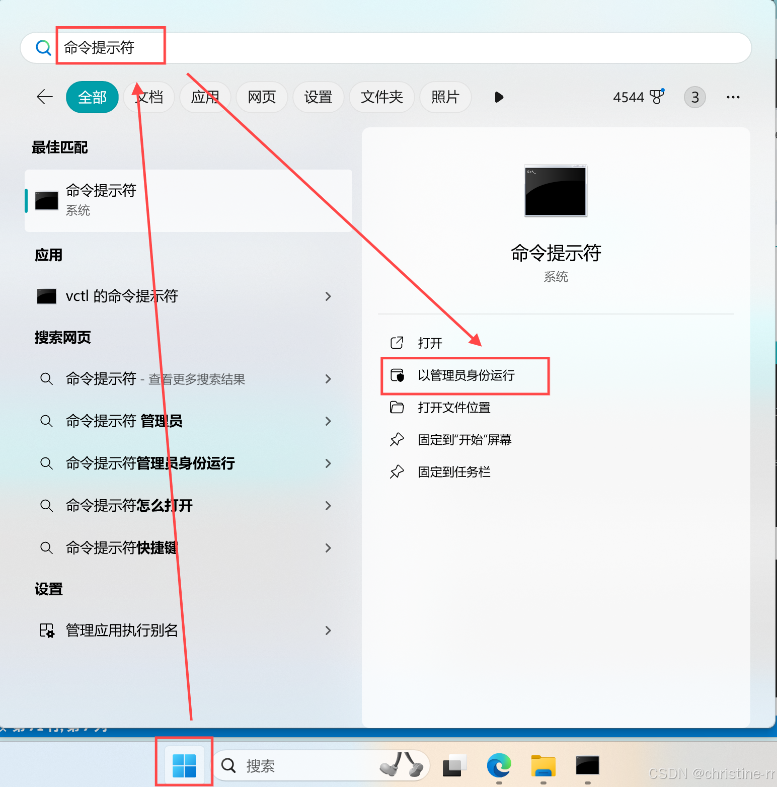 点击【开始 】,输入【命令提示符 】,选择【以管理身份运行 】命令提示符