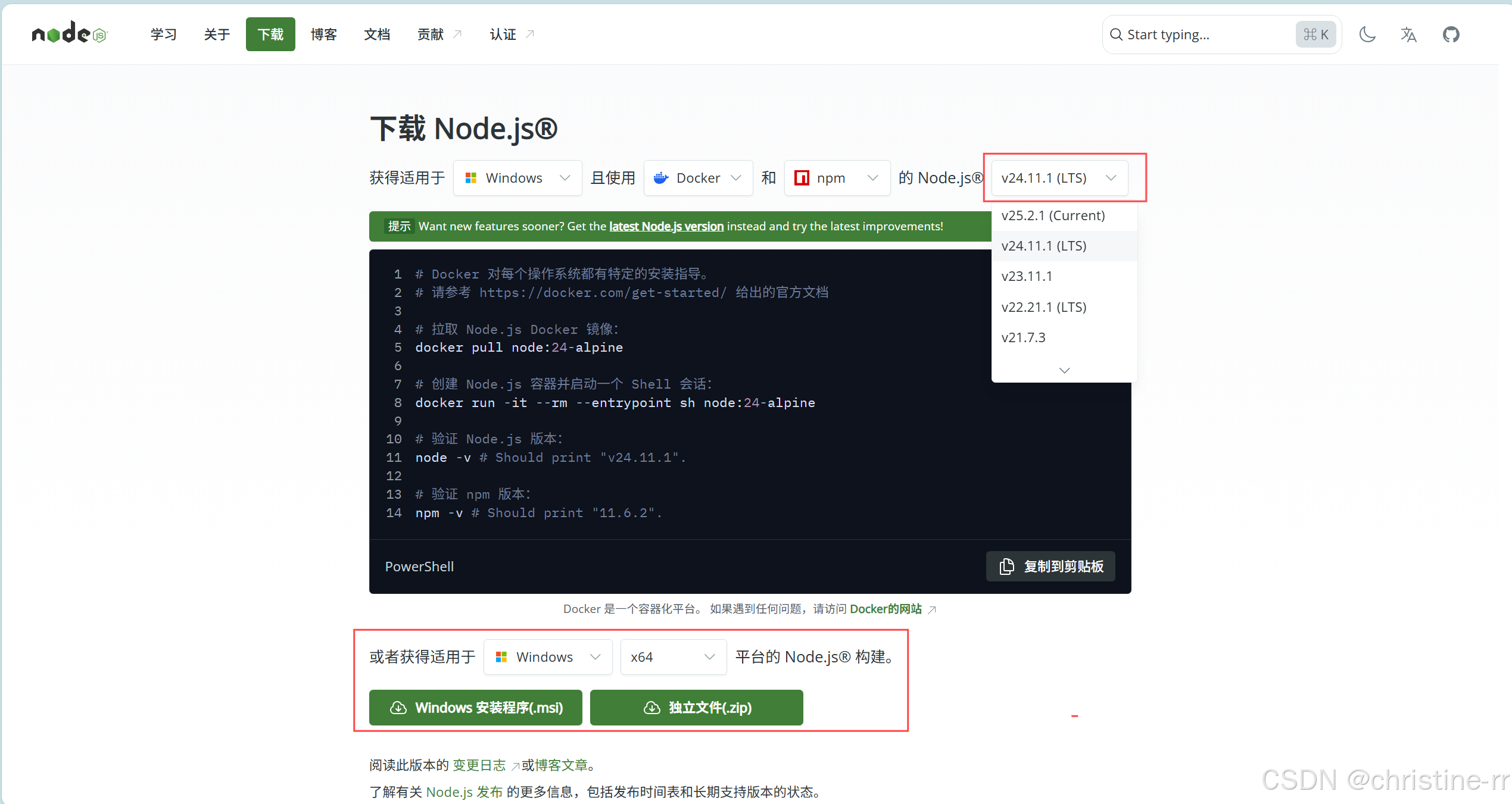 - 推荐下载 LTS 版本 (长期支持版,更稳定,适合生产环境),点击对应系统的安装包(通常是