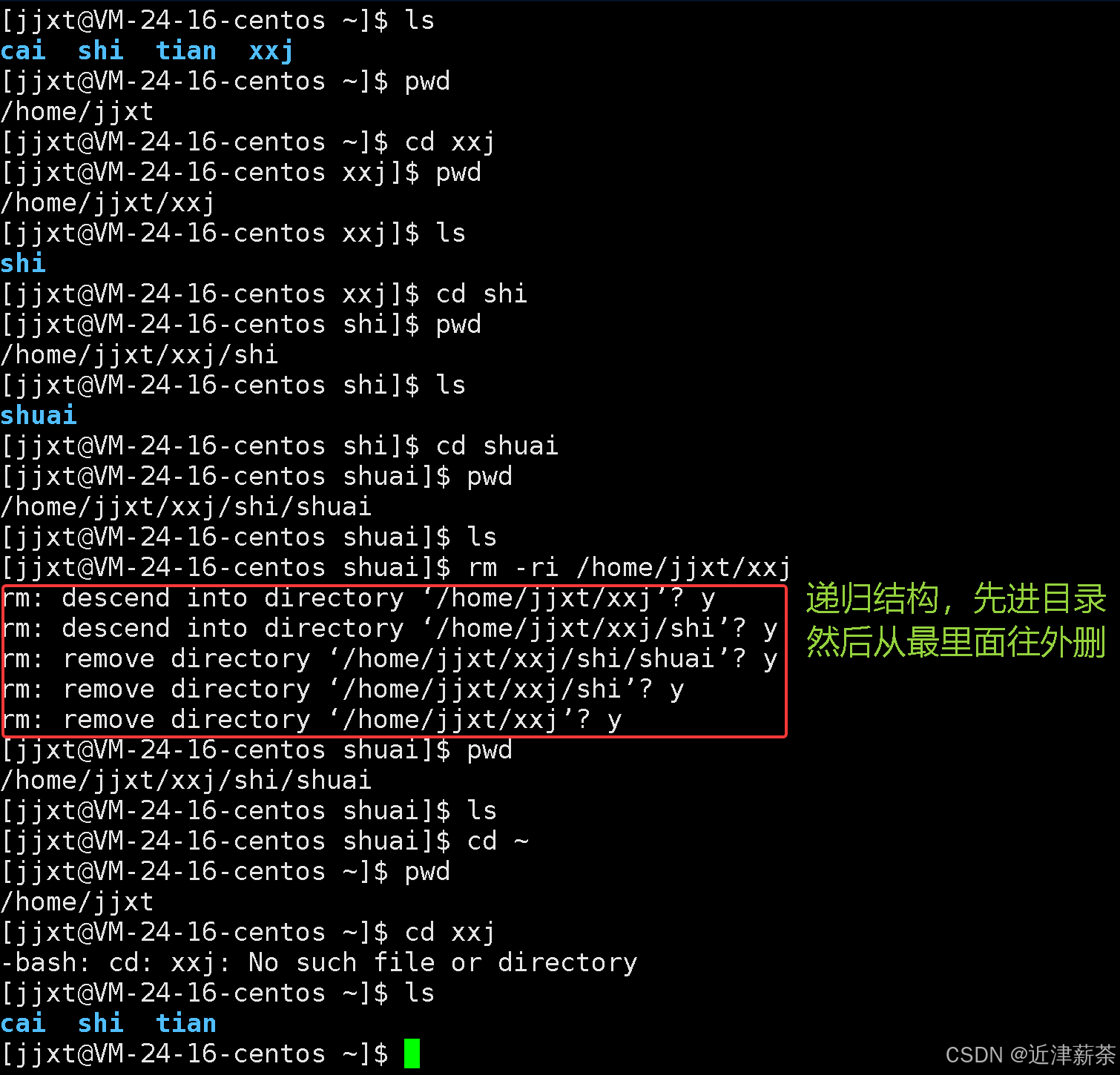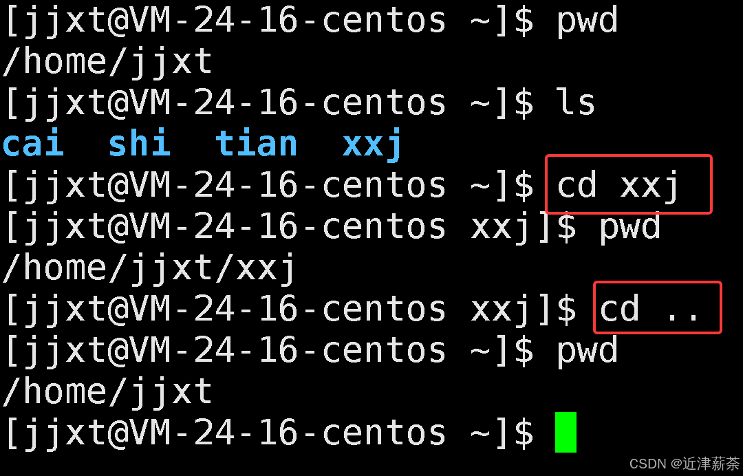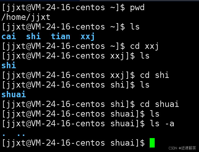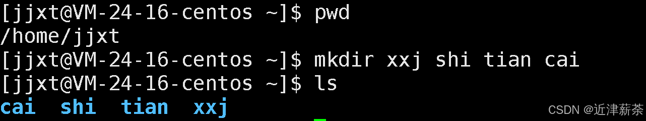 在/home/jjxt路径下创建 xxj shi tian cai 这几个目录,并展示。