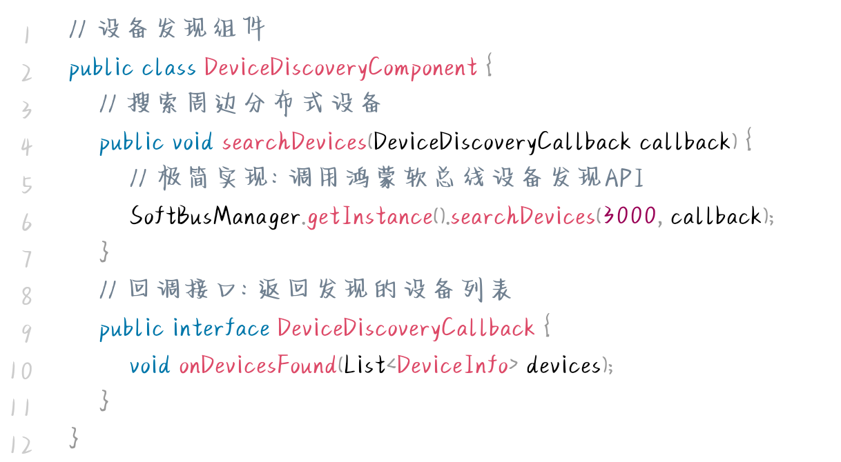封装鸿蒙分布式设备发现能力,提供设备搜索、列表返回的标准化接口: