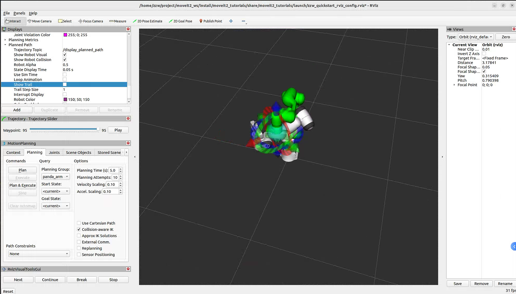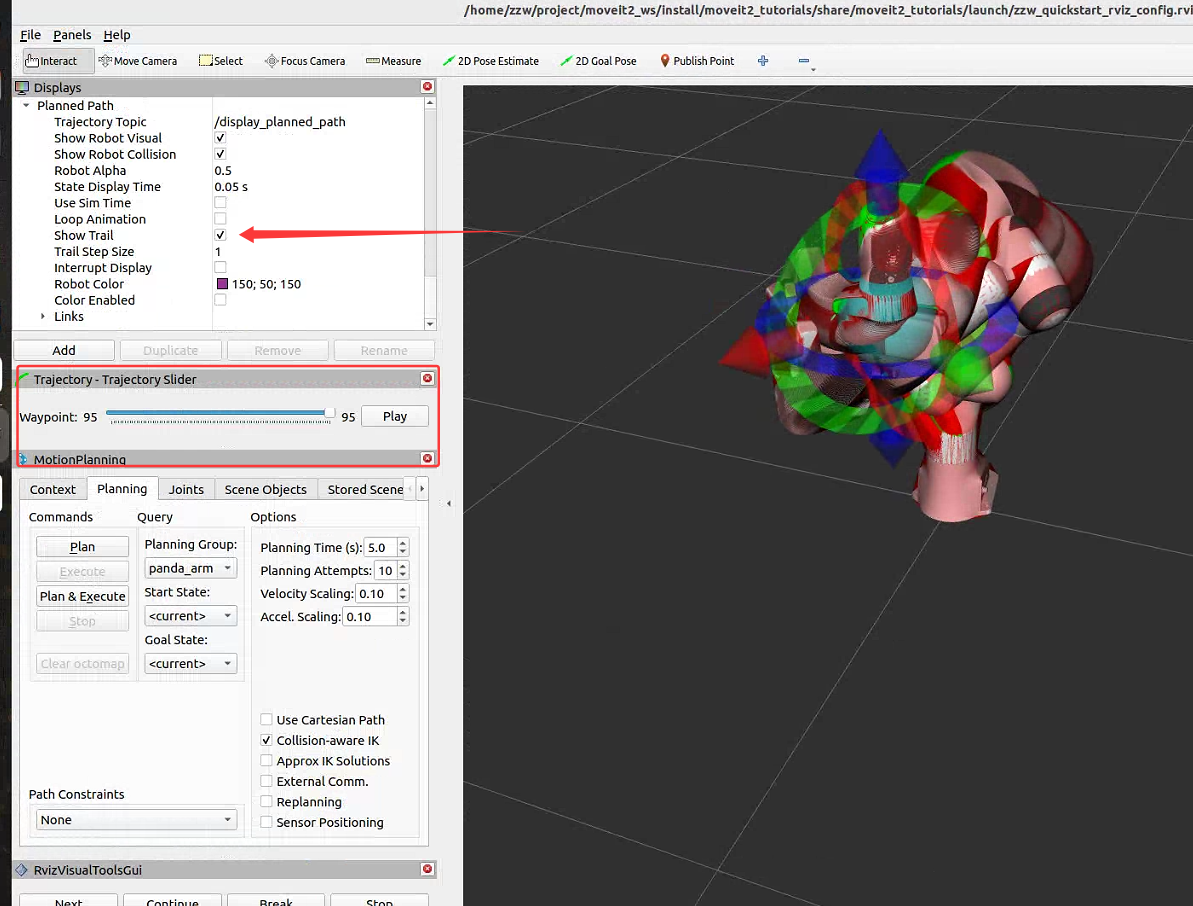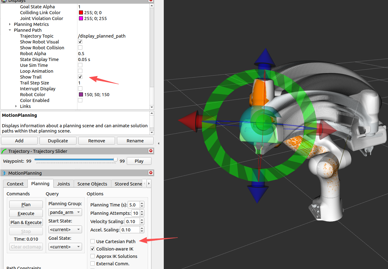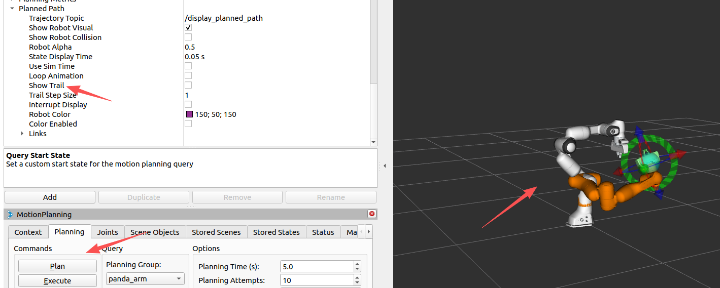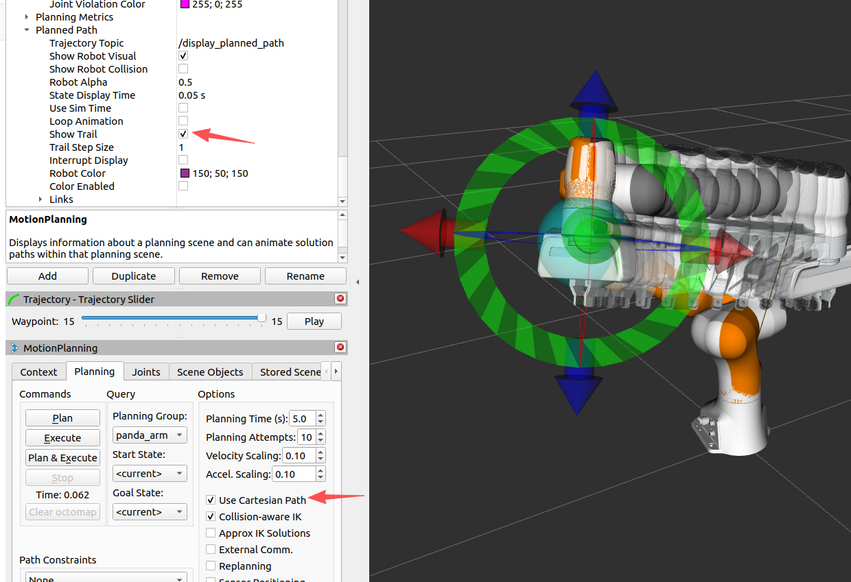- 规划路径:勾选 Planned Path 树形菜单中的 Show Robot Visual。