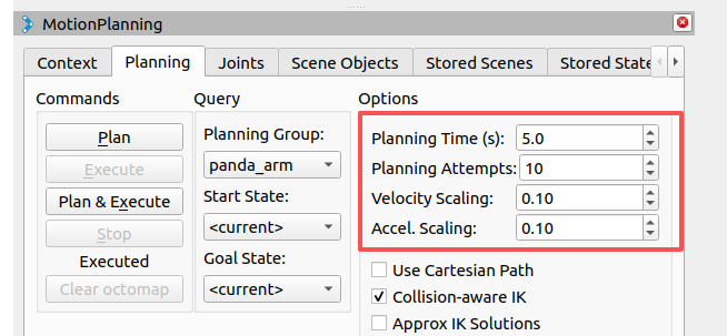 - 目标状态:勾选 Planning Request 树形菜单中的 Query Goal State。