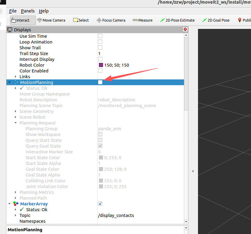 /base_link。 - 在 Displays 列表中点击 Motion Planning,进入机器人专属配置: