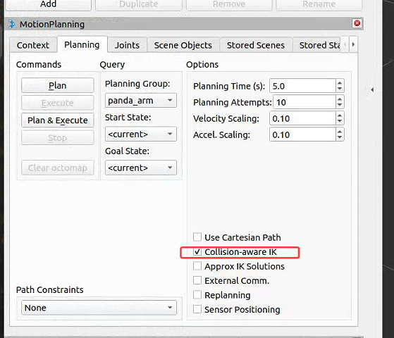 - 起始状态:勾选 Planning Request 树形菜单中的 Query Start State。