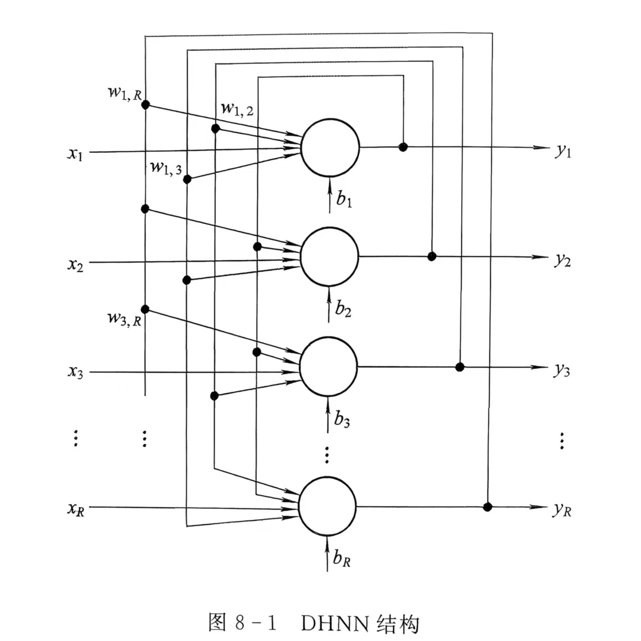 离散 Hopfield 网络是一种全连接的递归神经网络,每个神经元既作为输入也作为输出,网络结构如图所示: