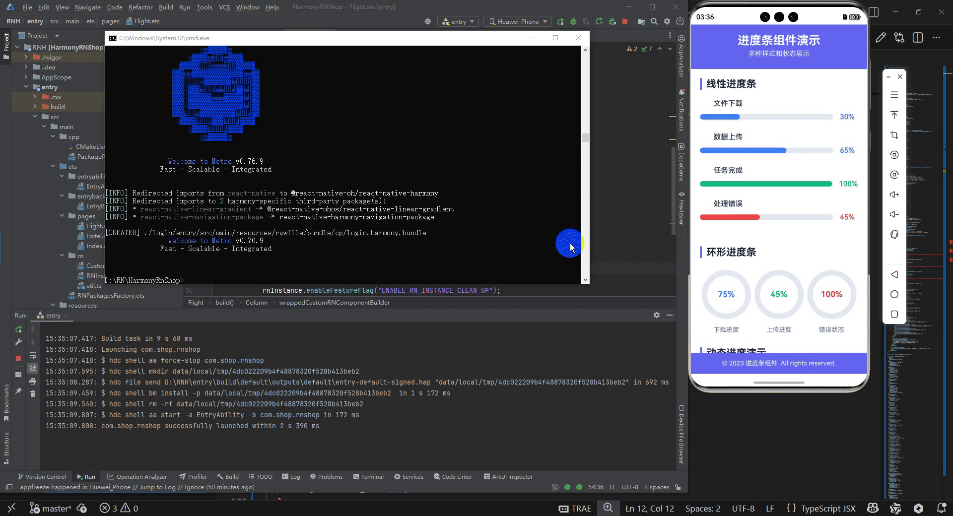 性能优化层面,React Native的进度条由于包含复杂的样式计算和SVG渲染,在频繁更新时可能遇到性能瓶颈。而鸿蒙的Progress组件在Native层实现,能够提供更高效的渲染性能。