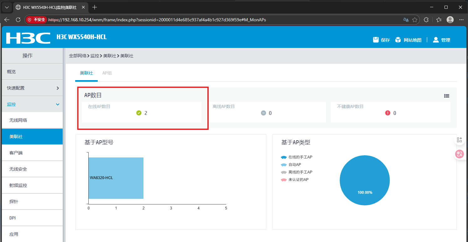 - 管理测试:Host主机应能通过Web界面(https://192.168.10.254)登录AC,并查看AP在线状态。